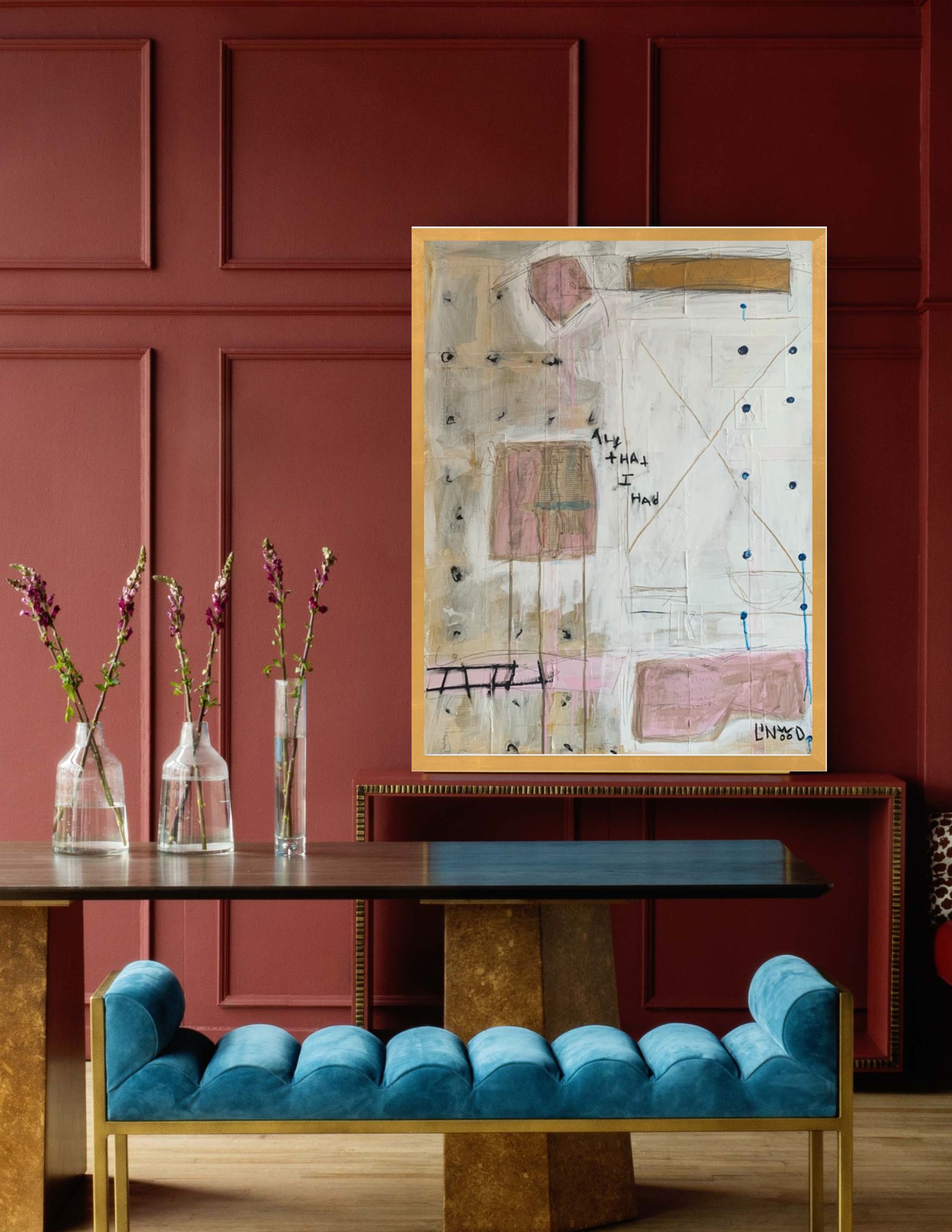 ABOUT LINWOOD: Linwood is a modern abstract artist with an impressive body of work – and an alter-ego. The artist Linwood is South + English’s very own Palmer Smith. A true master of mixed media, Linwood experiments with acrylic, oil, watercolor, pastel, pencil and even found objects in a diverse, intriguing and highly collectible oeuvre. Learn more about the artist now.