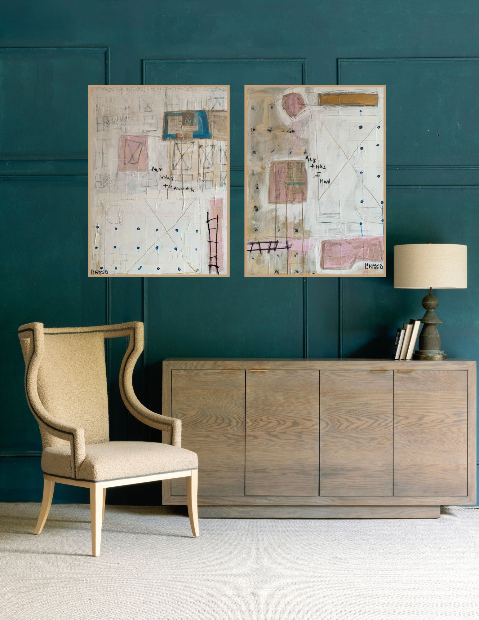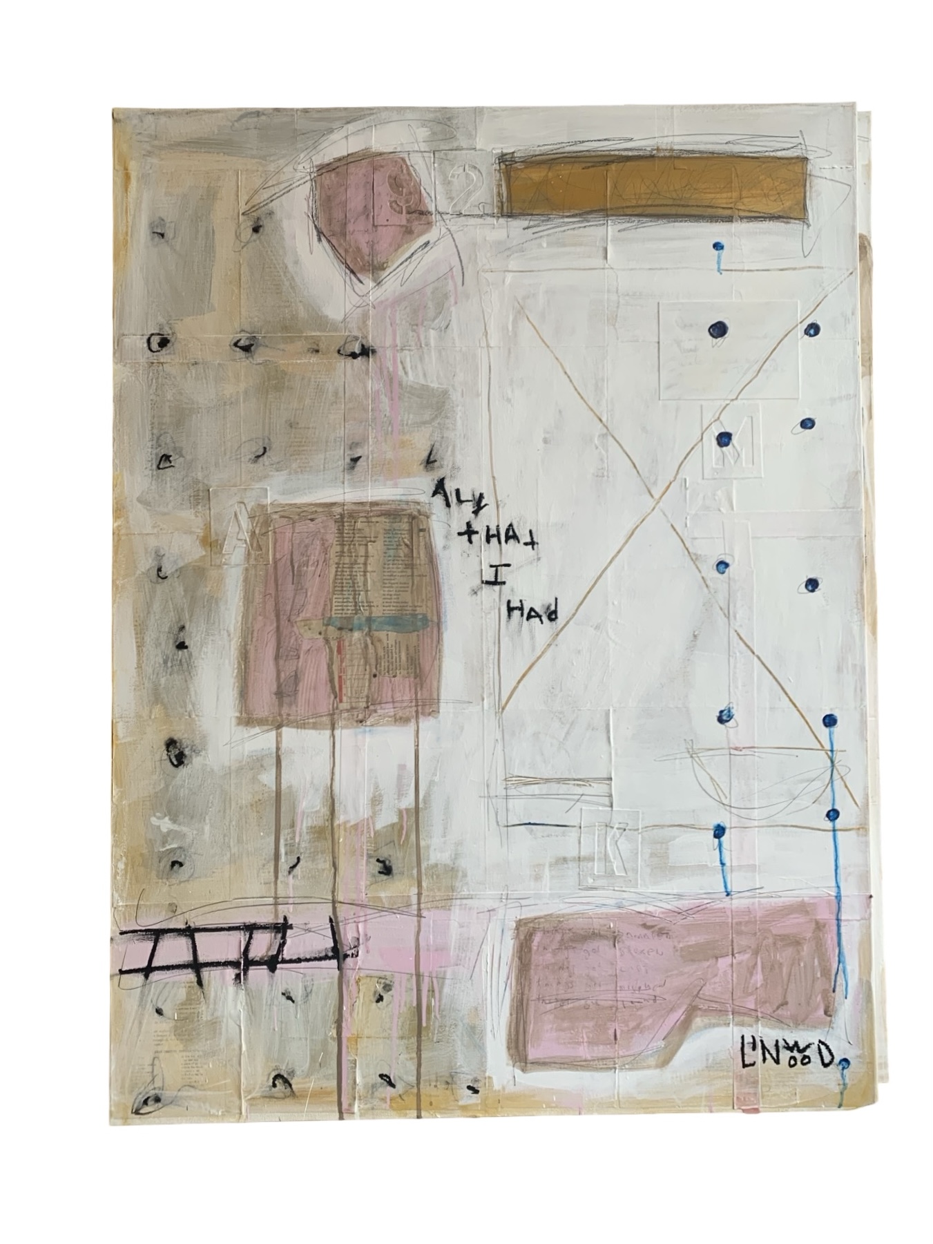 Quietly powerful and emotionally spare, All That I Had explores themes of offering, depletion, and vulnerability. Soft layers of warm neutrals—stone, linen, and blush—are built up and partially erased, creating a surface that feels weathered by time and experience. Linear marks, faint grids, and hand-drawn symbols suggest structure and order, while drips of pigment and gestural lines introduce moments of release and imperfection.
