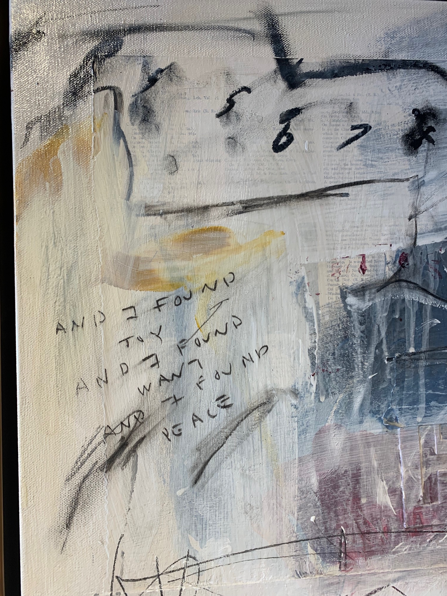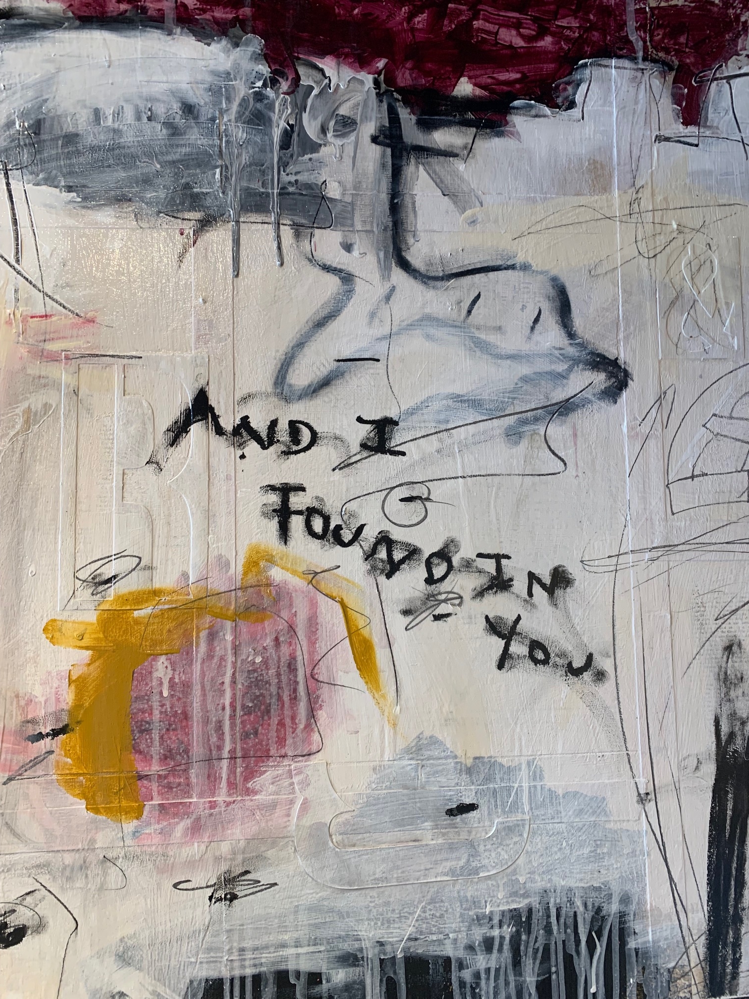 And I Found In You- a thought-provoking piece of fine art. The canvas is noteworthy for its rich brush strokes and artist graffiti. Take note of the bold use of burgendy in this piece. This boldness, Linwood’s language- bold, thoughtful, and fearless. A piece of modern art fit for unique interiors.