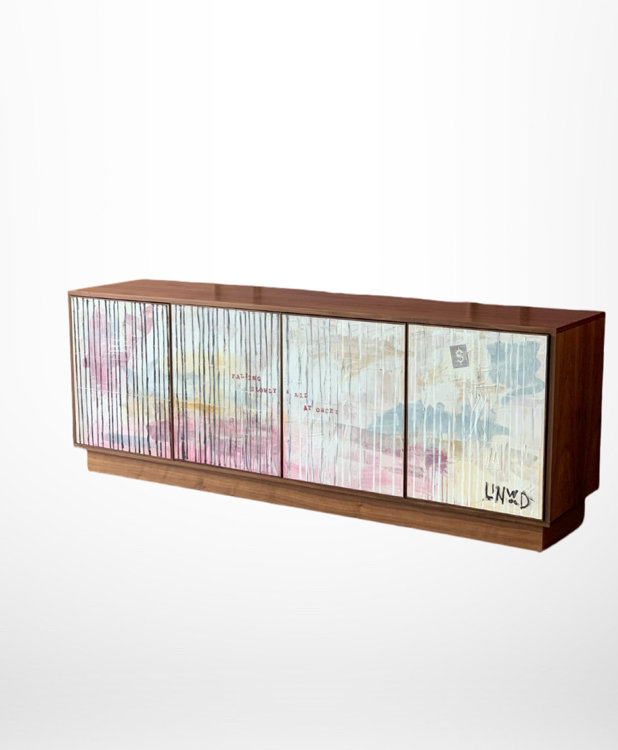 The Linwood Art Tank stands at the intersection of fine art and furniture — a striking example of functional artistry reimagined. Each cabinet is a canvas, showcasing Linwood’s masterful fusion of media: acrylic, oil, watercolor, pastel, pencil, and collaged found objects merge in unexpected harmony. The result is a singular piece that invites both contemplation and conversation.