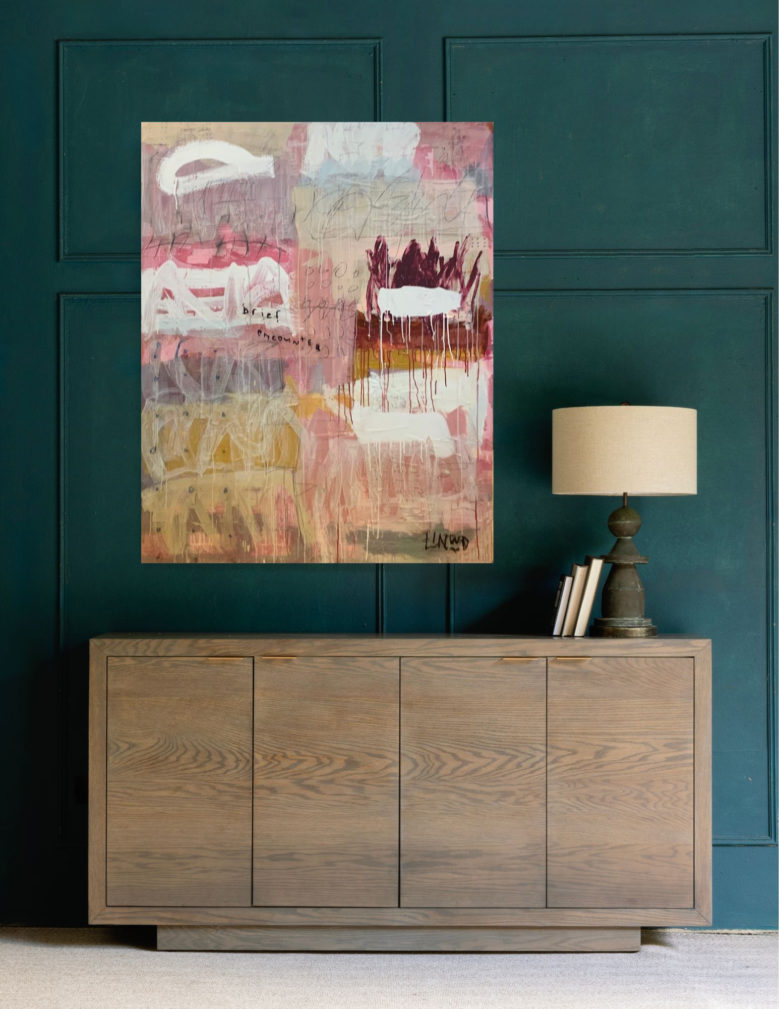 Gestural marks and translucent veils move across the canvas like fragments of memory, while drips of pigment introduce a sense of gravity and passage. Areas of opacity and transparency shift in balance, allowing forms to emerge and recede without fully resolving. Soft yet expressive, Brief Encounter brings warmth and quiet emotion to an interior—an artwork that reveals itself gently, offering depth, nuance, and a sense of passing time.