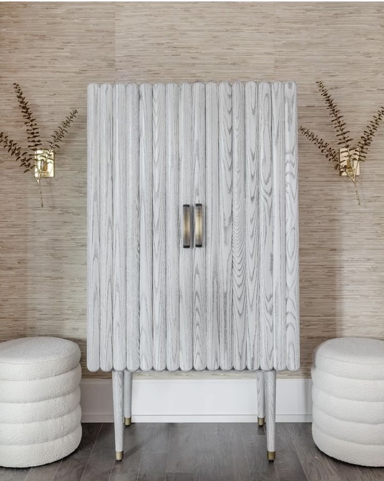 There is no diva quite like Callas. What range, talent, allure. This swanky bar cabinet can be completely outfitted for mixing and serving your favorite cocktail, or a simple cabinet with 2 shelves and storage interior. Shown in Dove Wing Grey, one of our many Bespoke finishes, the cabinet door fronts are a symmetrical repeat of individual vertical ribs, finished with Giacometti Gold pulls. Set on inset tapered legs. Bespoke finishes are specially calibrated and nuanced on either solid oak or maple. Ask about South + English’s Kaleidoscope paint-match program. Skillful Crafted in USA.
