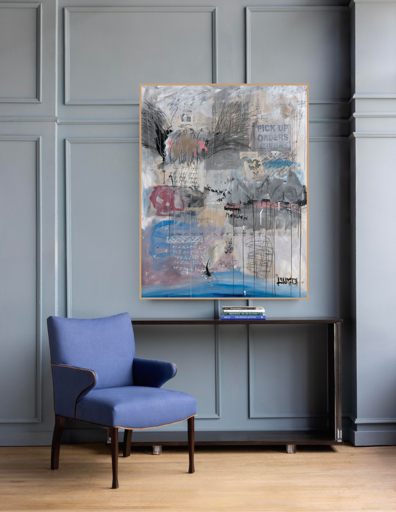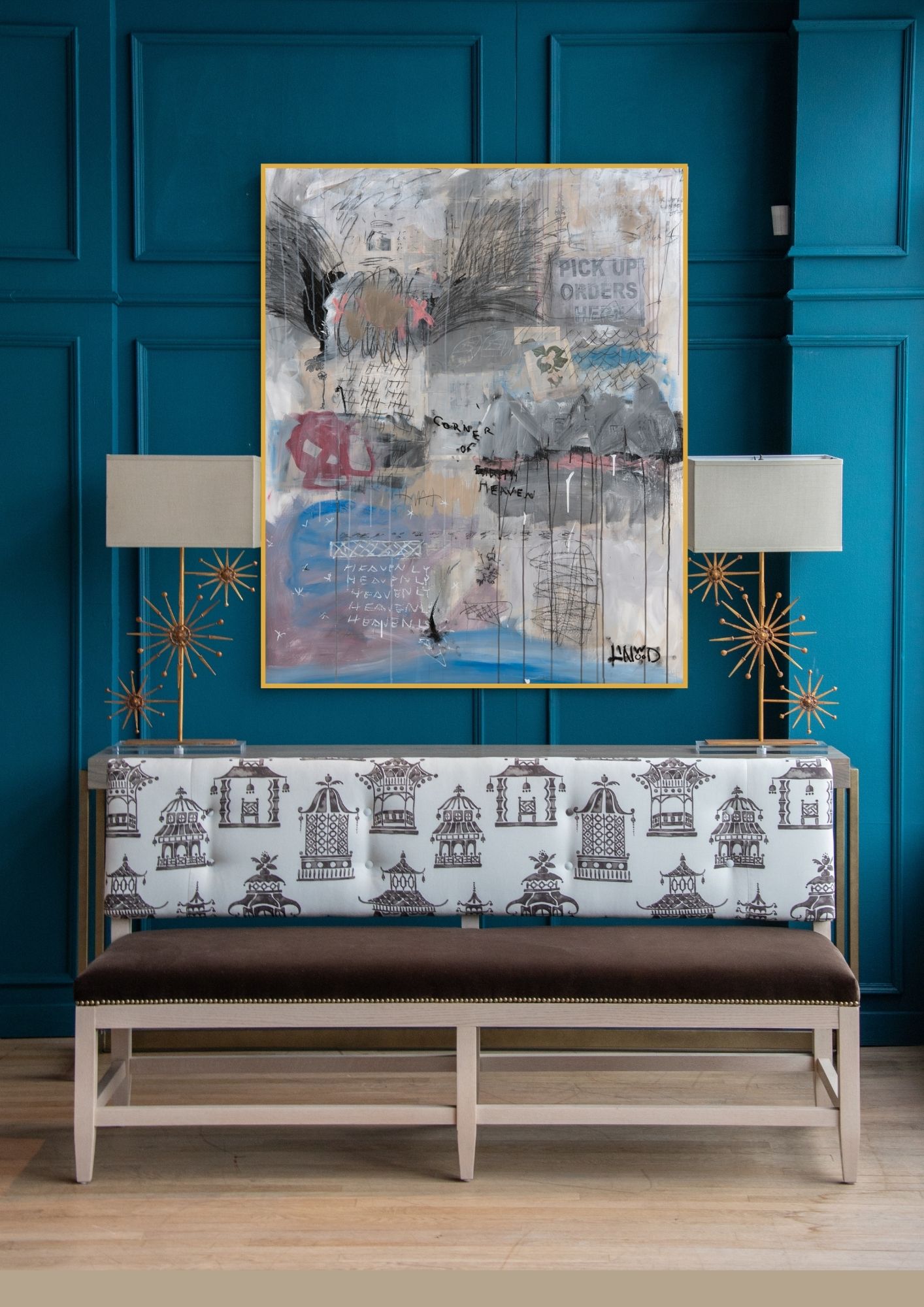 Linwood; Atlanta-born artist is know for making modern art made for uncommon interiors. This canvas is loud and tells its story through the bold, contrasting colors throughout. The epitome of Linwood’s language: rich blue brush strokes, graphic shapes, casual calligraphy.