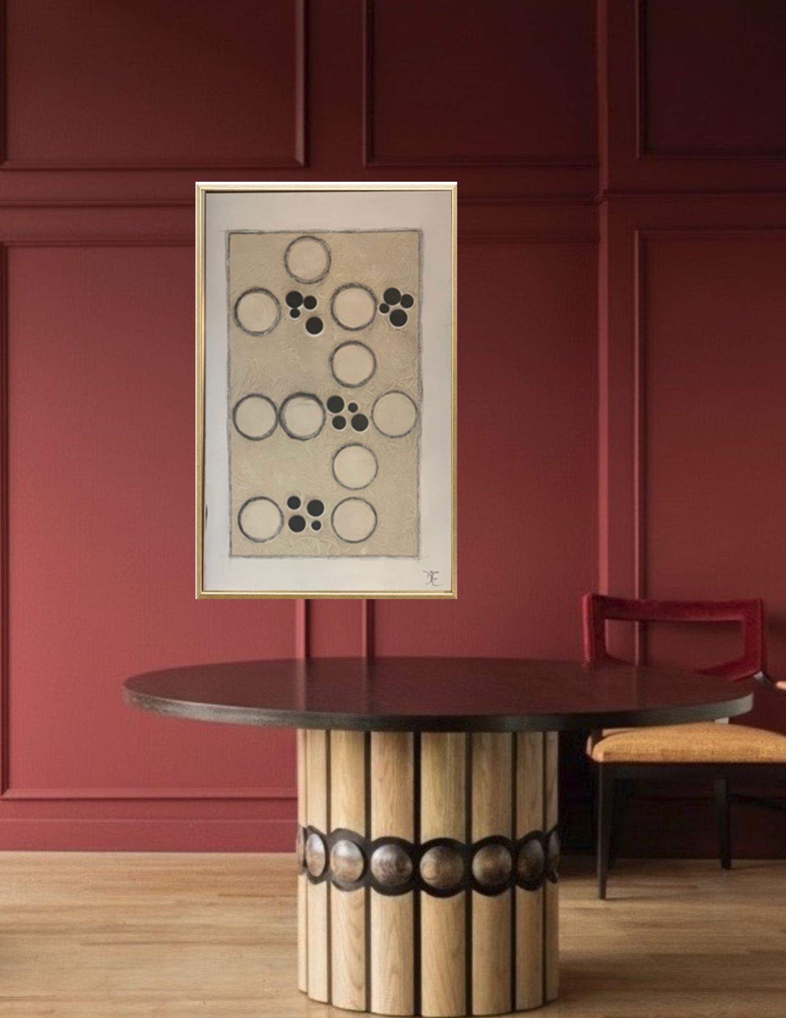 Measured and intentional, Directions explores orientation, movement, and the quiet logic of placement. A series of circular forms—some open, others filled—are arranged in a structured vertical field, reading almost like a coded map or navigational system. Each grouping suggests a point of decision, a pause, or a shift in course.
