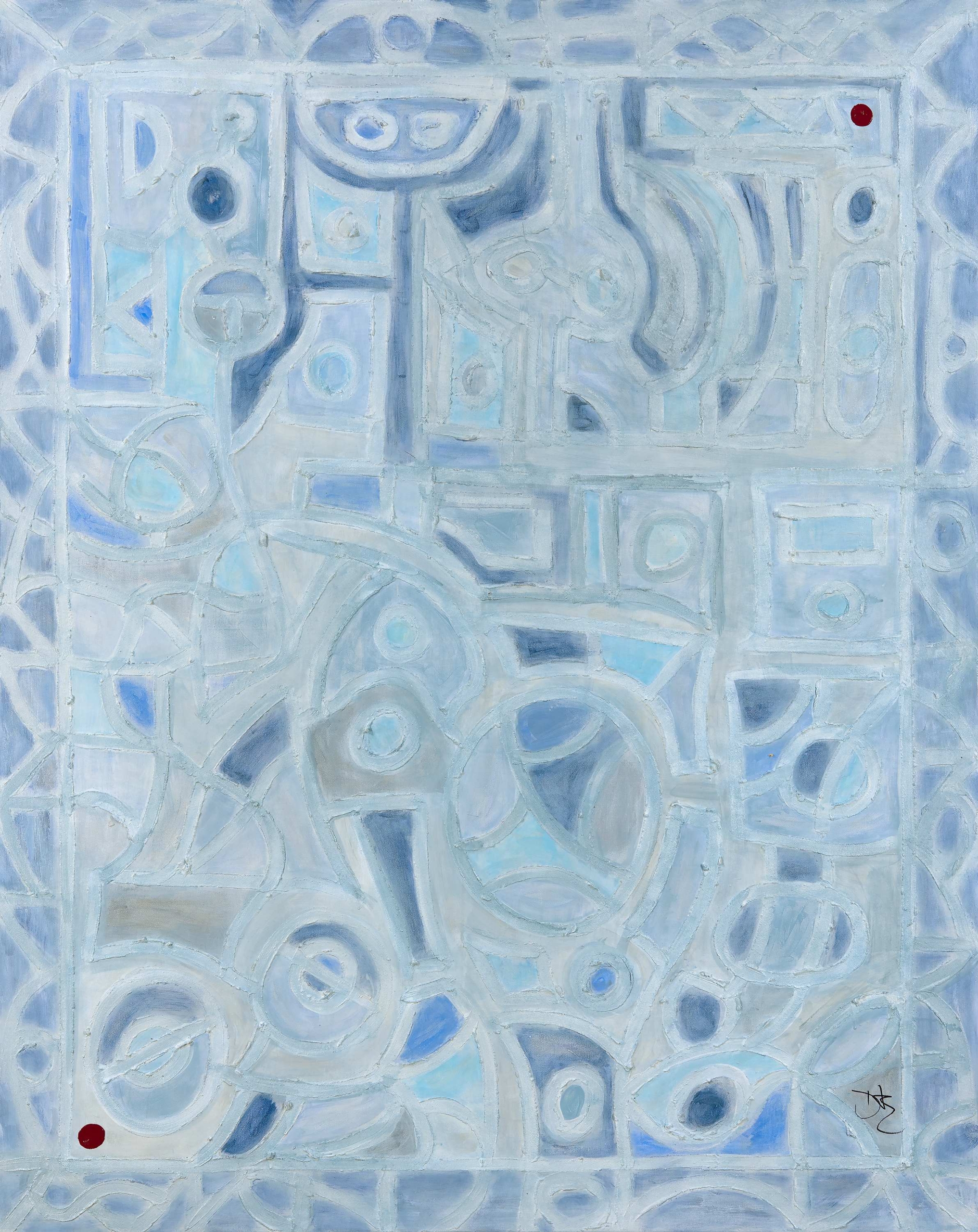 Emotional Roadmap- a perfect title for an emotionally powerful piece. DJE uses his art as an expression of life’s journeys and relationships, using shapes, patterns, color and texture as a symbolic interpretation of how things felt at the time. This piece is complex, deep, and captivating. Wood, fabric, paint and plaster on canvas are all in play. Mixed media on canvas.