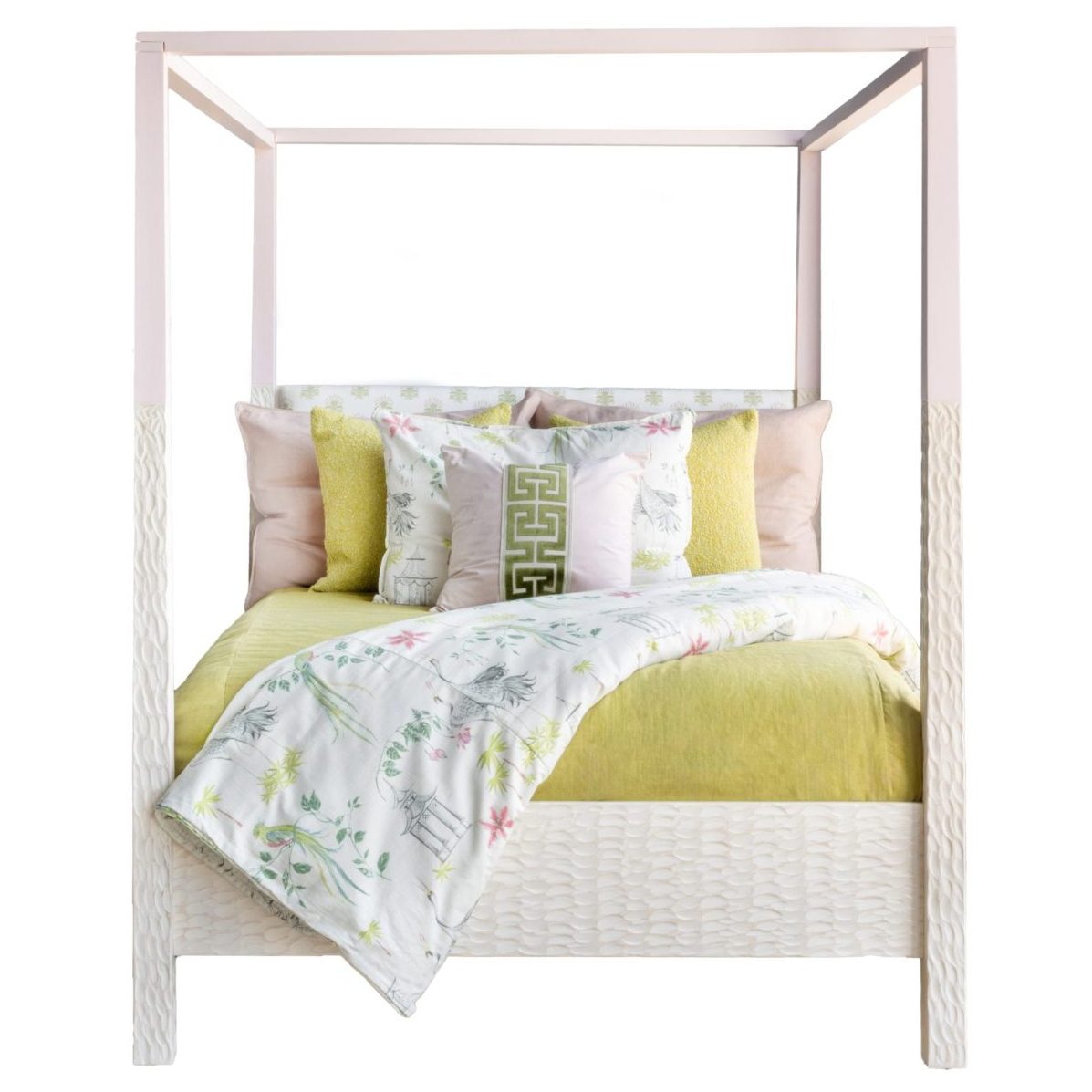 The Genevieve Bed introduces a striking new expression to the South + English bed collections. Showcasing artisan-gouged pine paired with our new Gossamer finish. Masterfully carved textures rise with lightness and refinement, set in deliberate contrast to the smooth, sleek canopy structure above. The result is a study in balance — tactile and architectural, grounded yet ethereal.