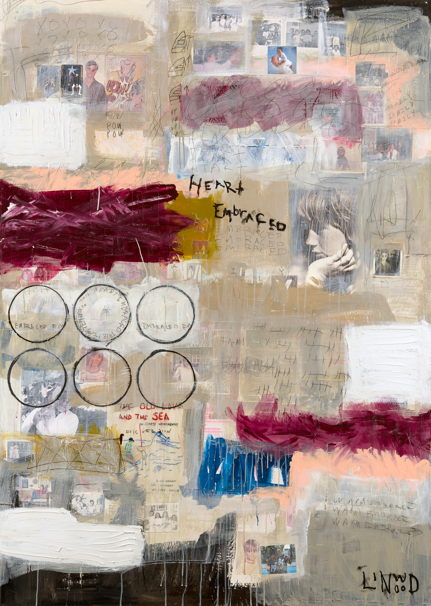Some of Linwood’s newest abstract art is bold in both color and neutral hues. Here, various shades of grey interact with pure blacks, and pops of muted pastels. Linwood’s brush strokes are confident and assured – serene and unchanged. The canvas is noteworthy for strong graphic appeal, texture, layers of glazed and overpainted documents and artist graffiti. Modern art for uncommon interiors.