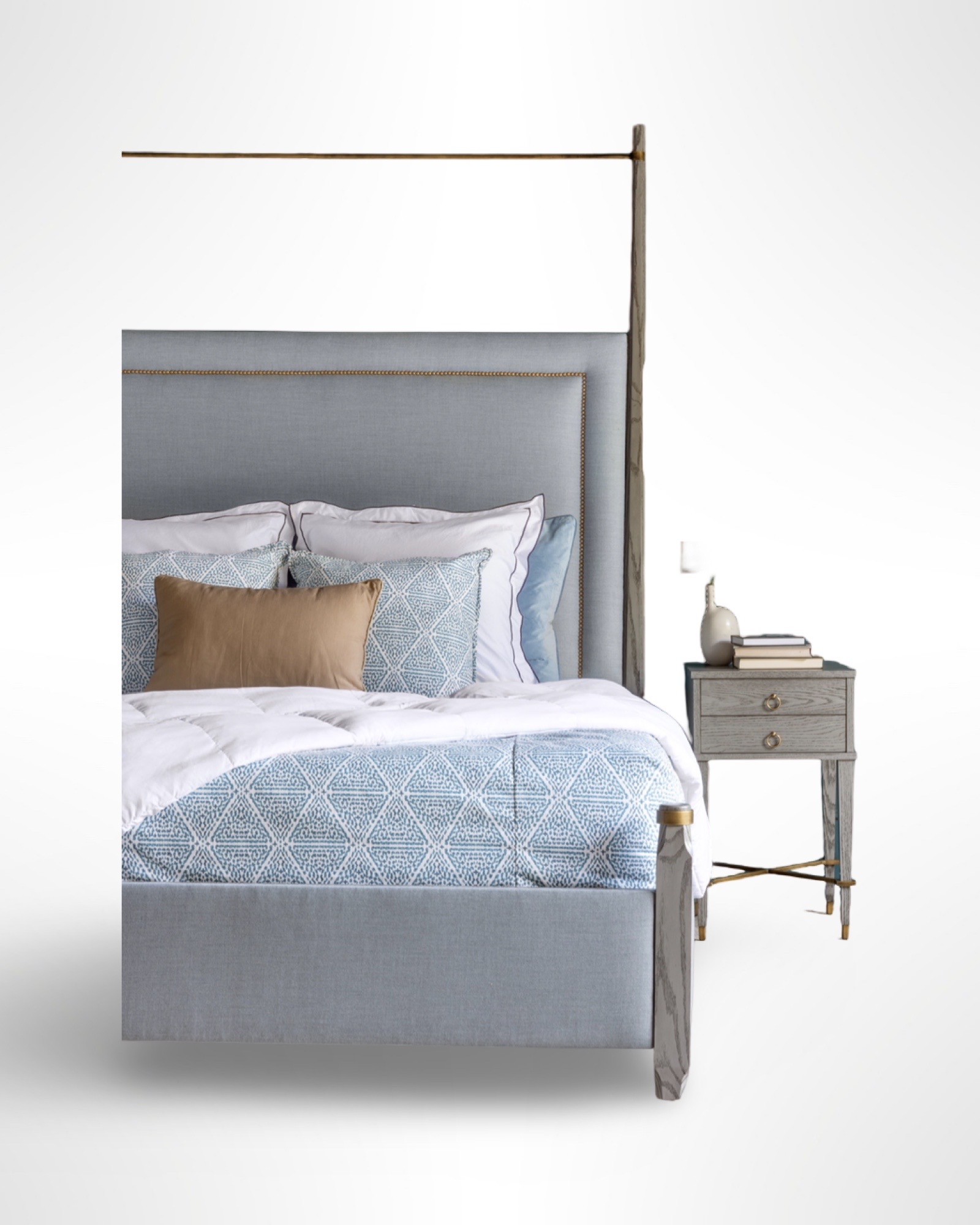 Helena’s beauty stands undisputed throughout history, and you’ll agree. Helena’s tall, faceted and tapered posts ascend to an open canopy of hand wrought metal, which can be ordered in five metal finishes to complement any of our Bespoke wood finishes. She is available however you please – specify whether you prefer an upholstered headboard, footboard, or no upholstery at all. Hand Crafted in USA. Priced as shown with Red Oak frame with a Demi Metal canopy and upholstered headboard. Other pricing options available!