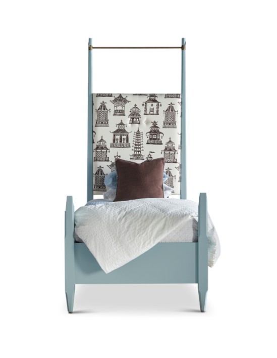Helena’s beauty stands undisputed throughout history, and you’ll agree. Helena’s tall, faceted and tapered posts ascend to an optional canopy of hand wrought metal, which can be ordered in five metal finishes to complement any of our Bespoke wood finishes. She is available however you please – specify whether you prefer an upholstered headboard, footboard, or no upholstery at all. Customizations welcome. Hand Crafted in USA. As a Bespoke bed you can pick between a Twin and a Twin XL. Priced as shown, Maple wood frame with a metal canopy and upholstered headboard only.