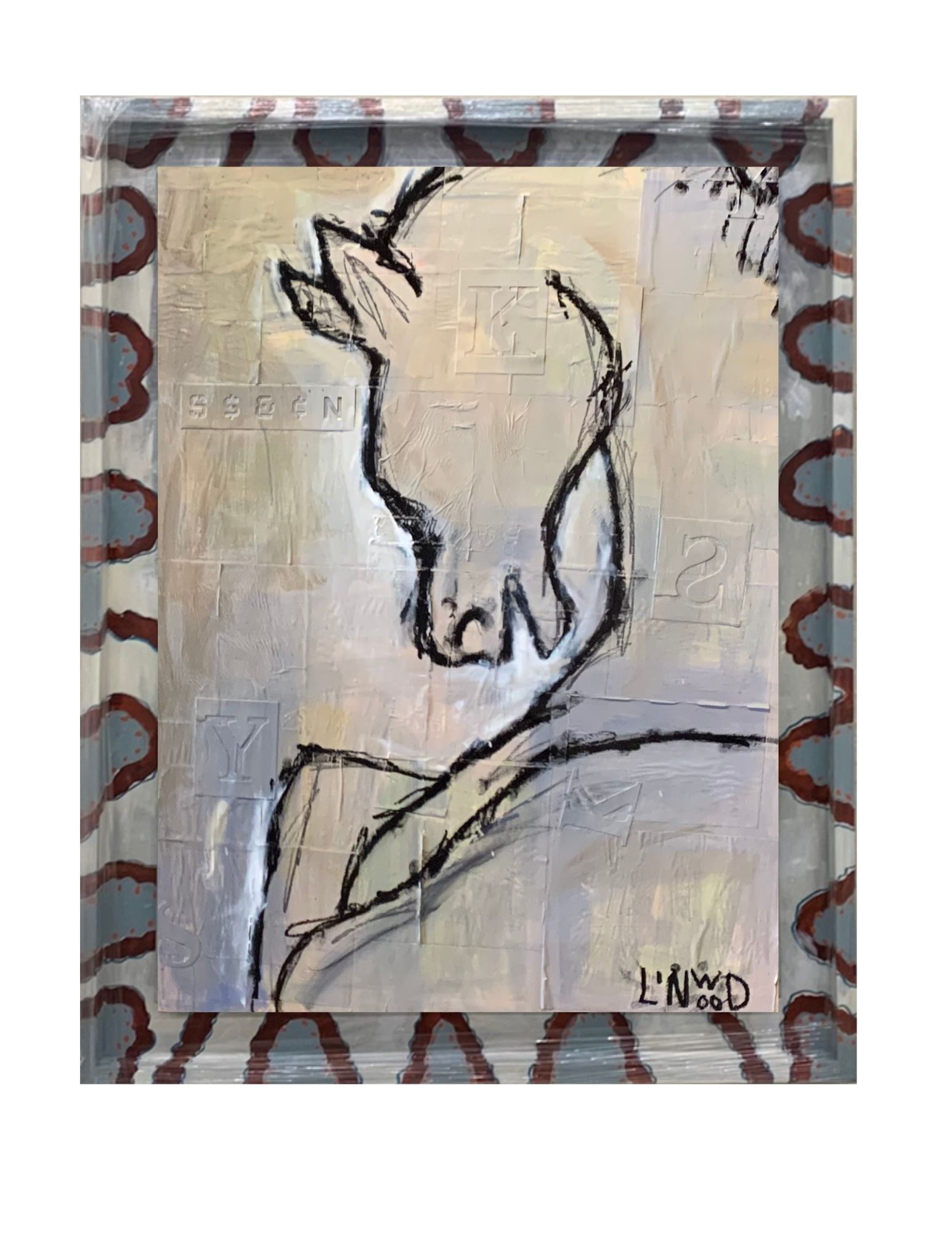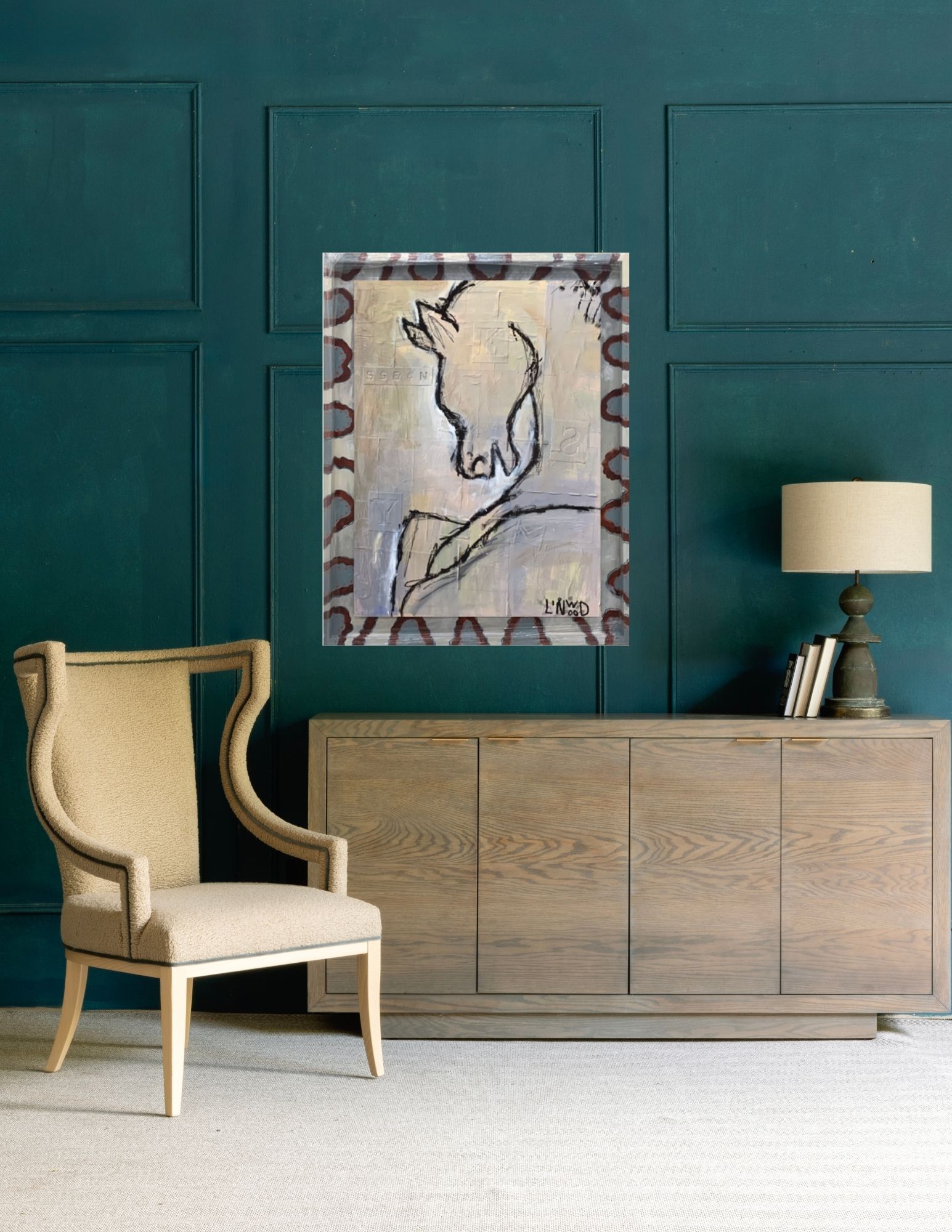 Framed by a custom, hand-painted border that echoes rhythm and repetition, the piece carries a sense of cadence—both grounded and expressive. Linwood’s signature language is present in the interplay of gesture, texture, and abstraction, transforming a familiar subject into a refined, contemporary statement.