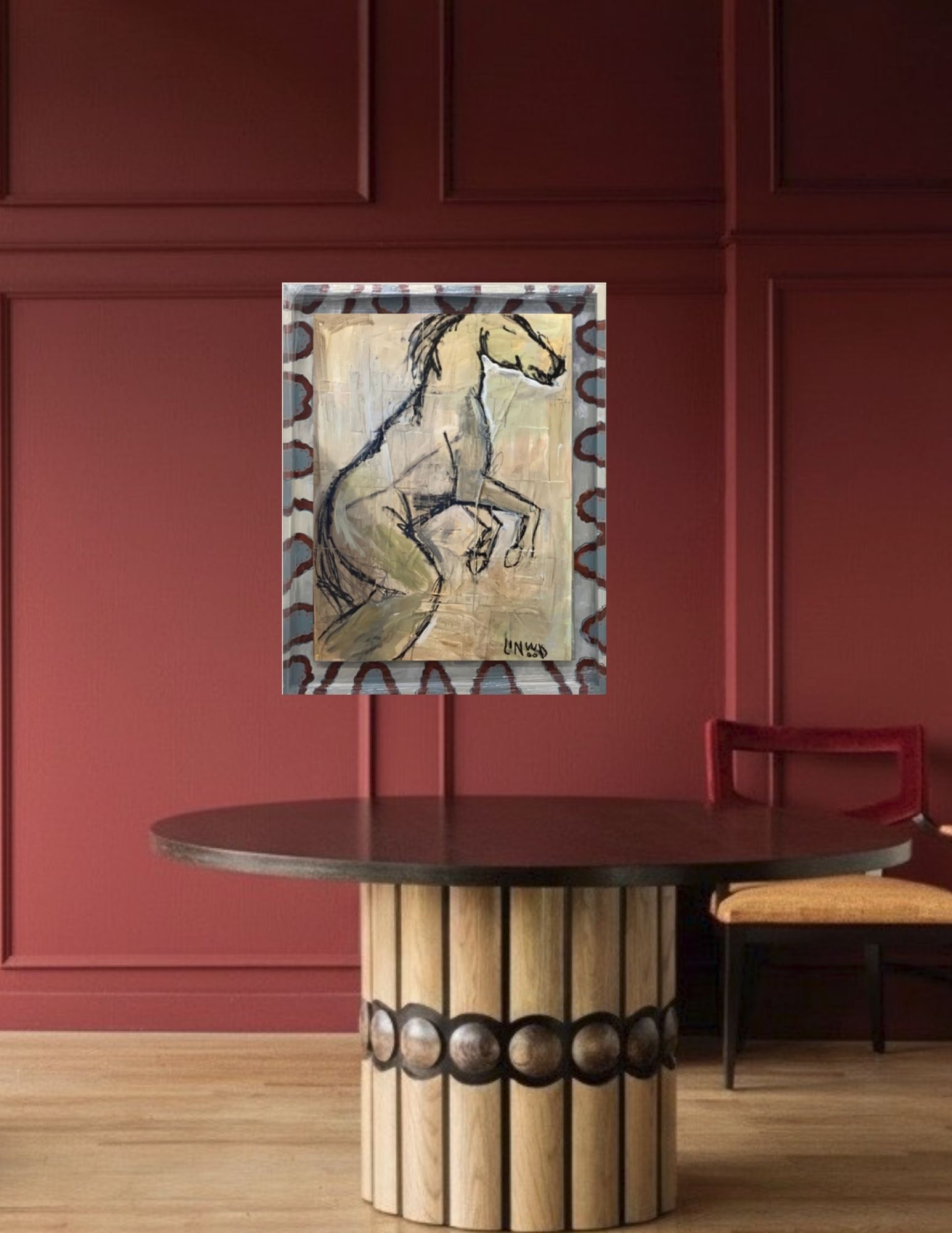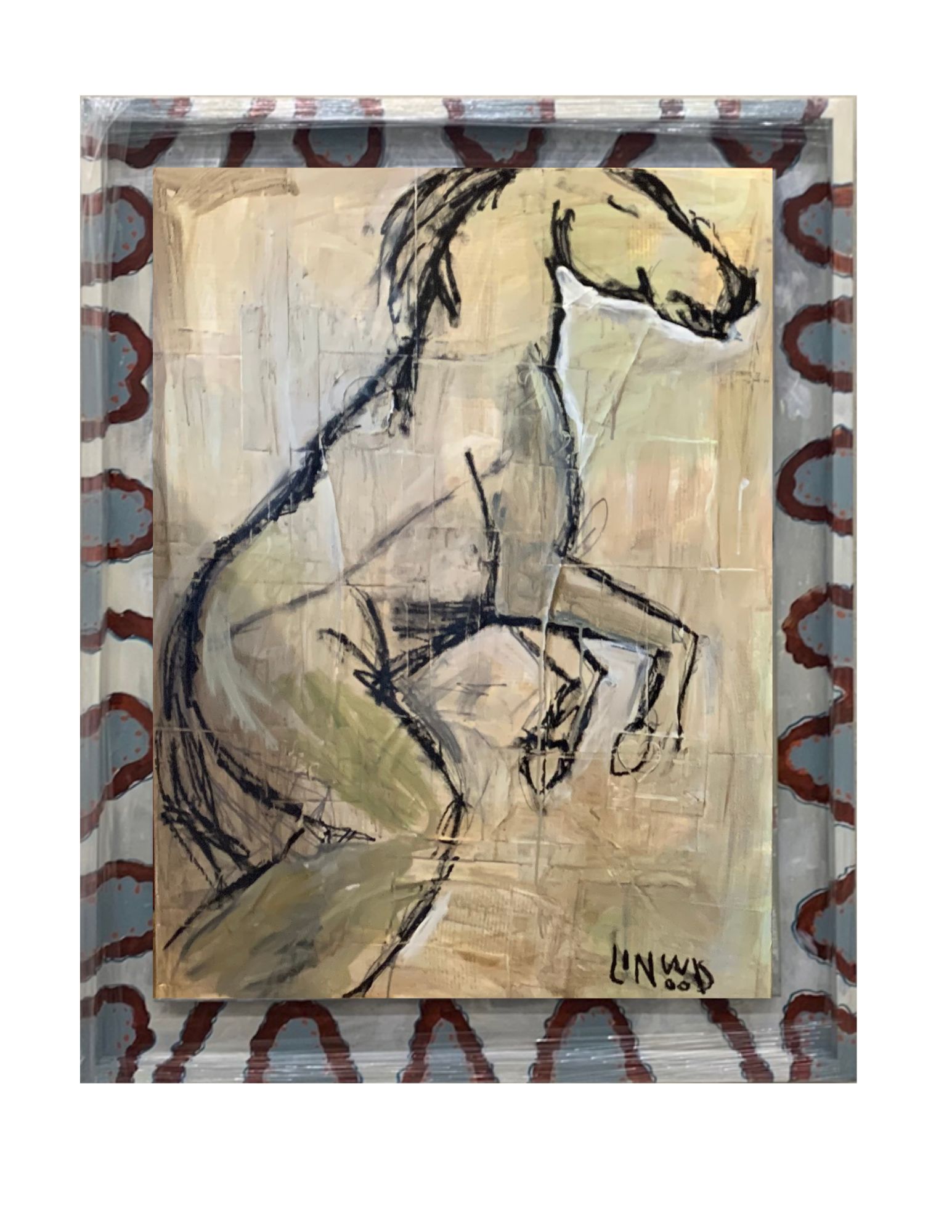 Framed by a custom, hand-painted border that echoes rhythm and repetition, the piece carries a sense of cadence—both grounded and expressive. Linwood’s signature language is present in the interplay of gesture, texture, and abstraction, transforming a familiar subject into a refined, contemporary statement.