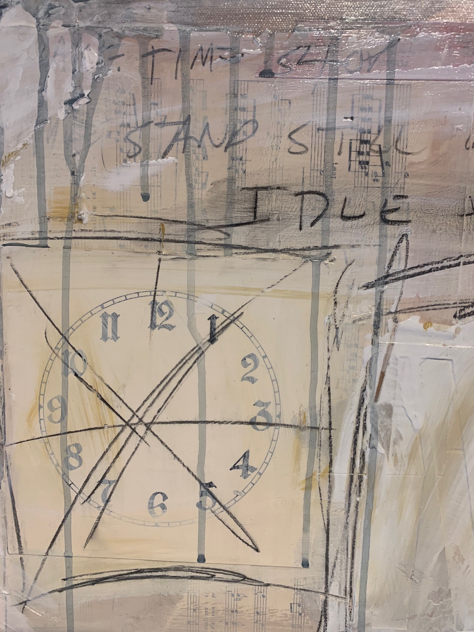 Idle Thoughts- a piece that tells a story of time. The name creatively and thoughtfully fitting with the symbolism embedded into the canvas. The canvas is noteworthy for texture, layers of glazed and overpainted documents and artist graffiti. Take special note of the many clocks throughout the piece and how they relate to the surrounding elements.