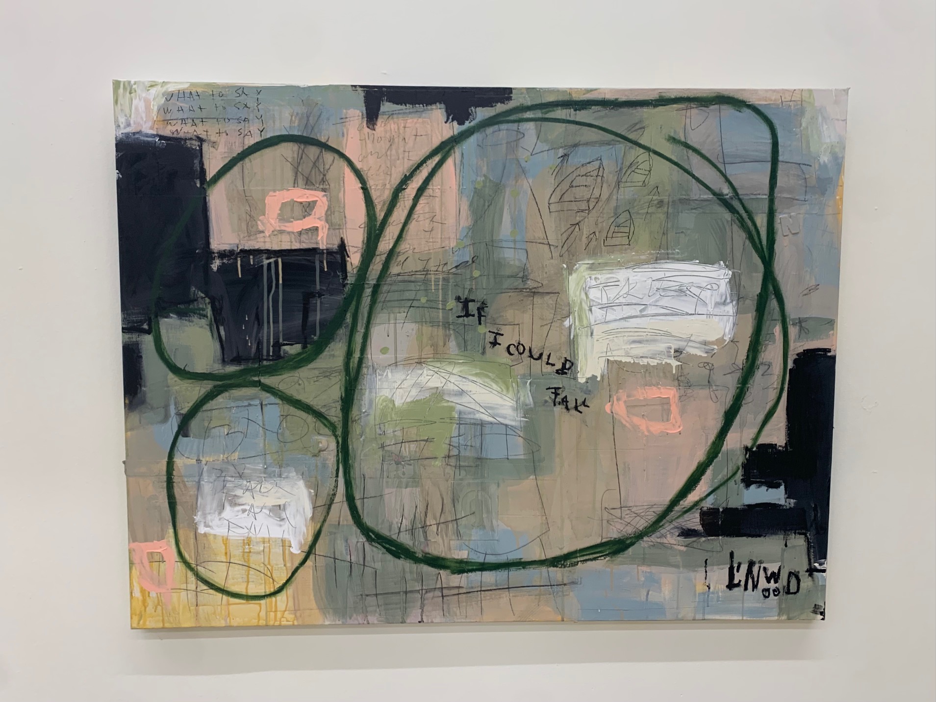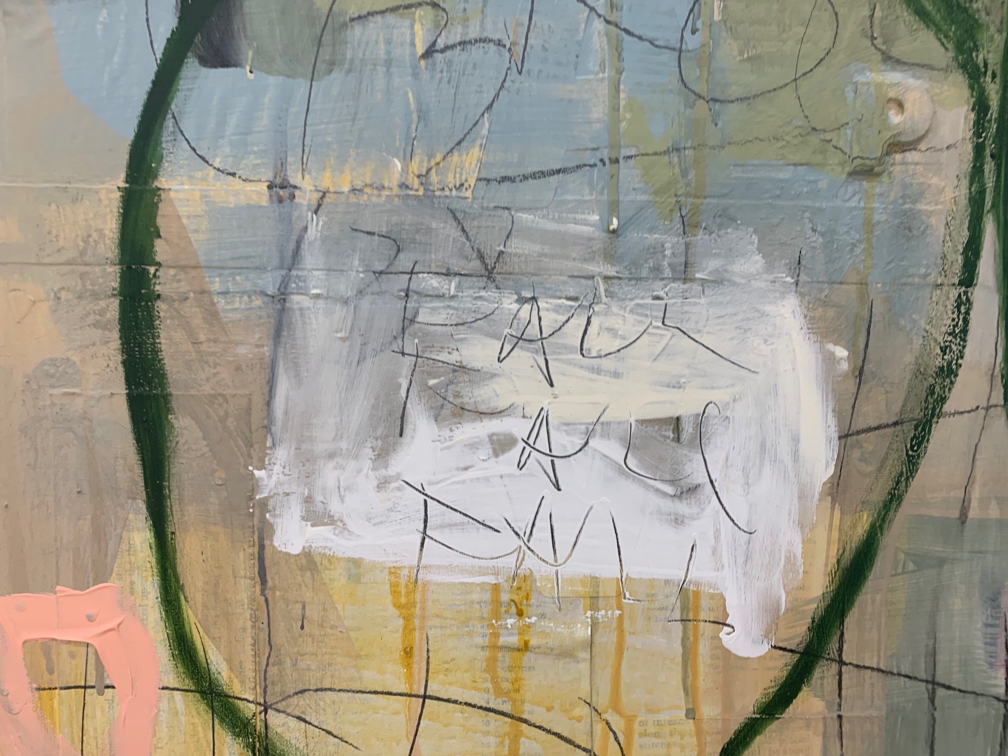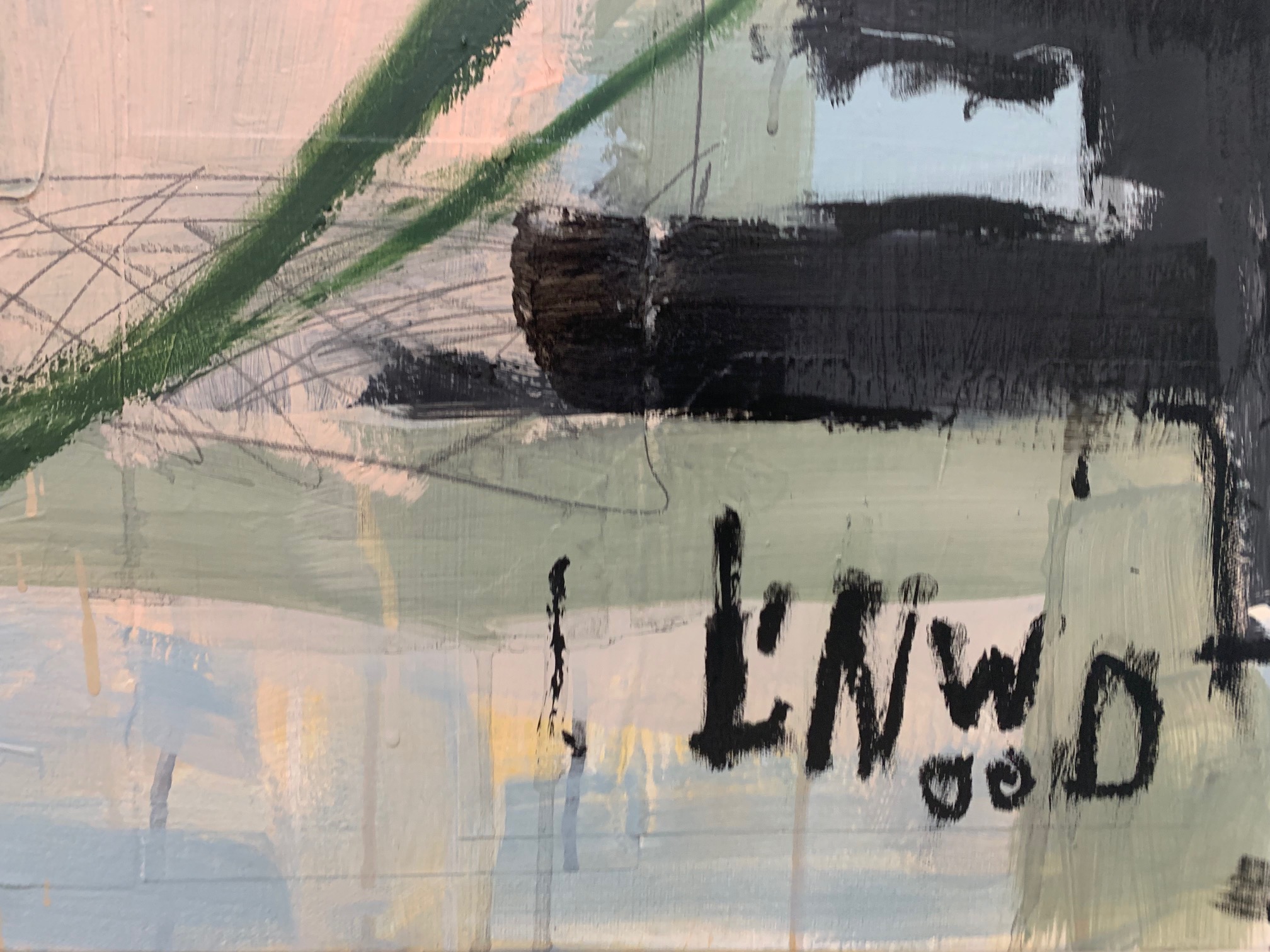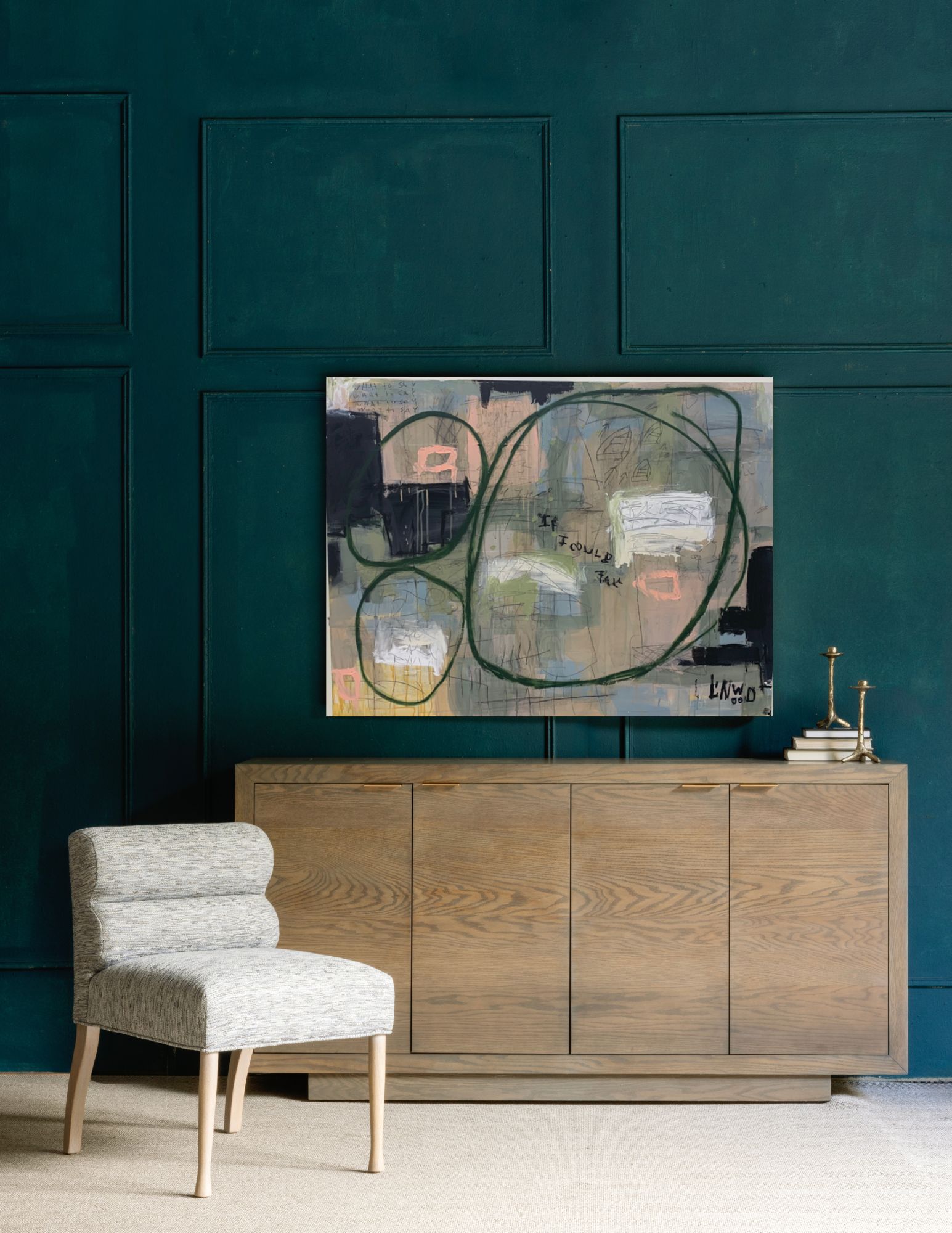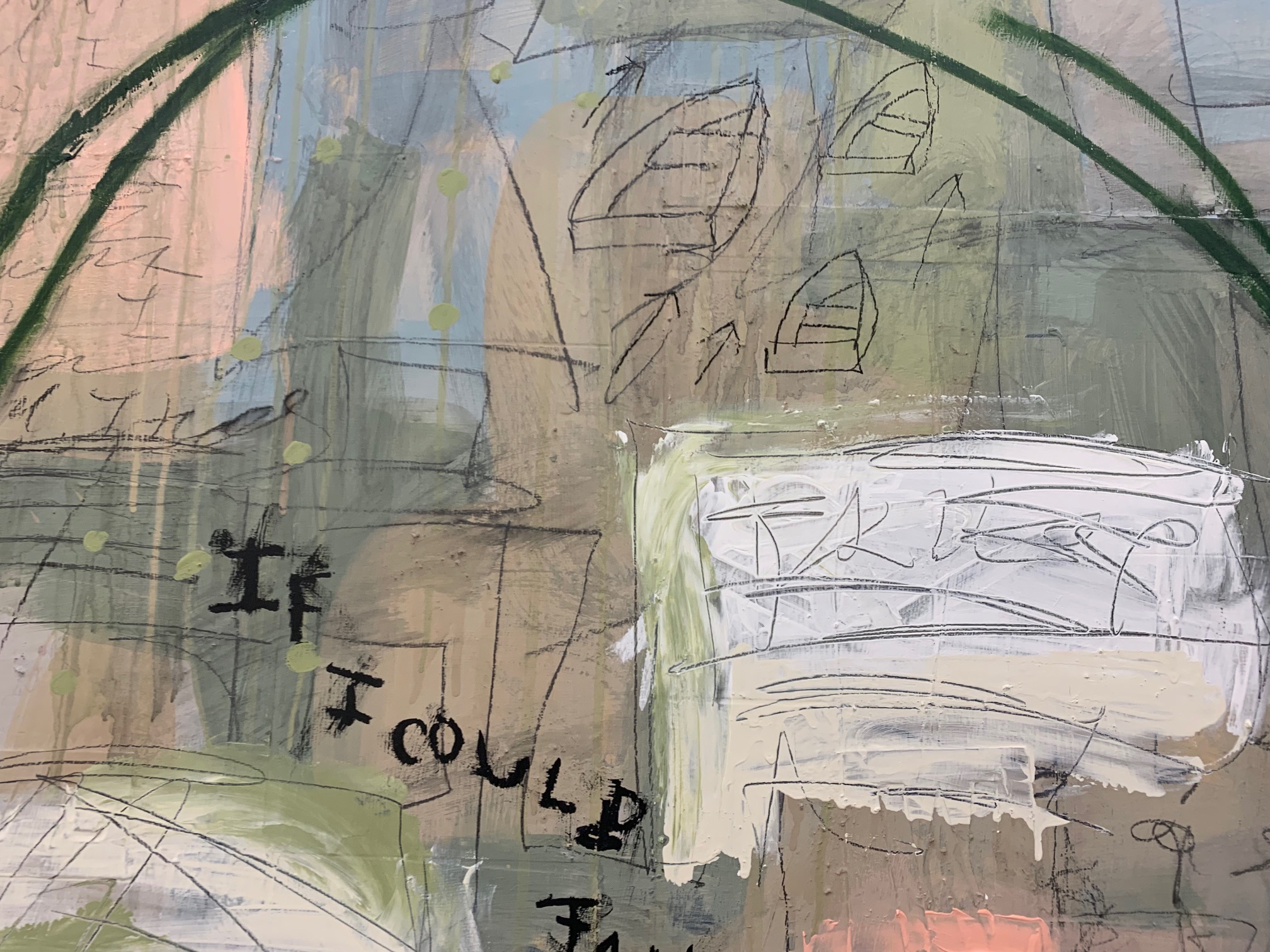 If I Could Fall reads like a visual confession—layered, imperfect, and emotionally charged. Earthy greens, muted blush, soft stone, and charcoal black are built up in translucent veils, creating a surface that feels excavated rather than painted. Looped, hand-drawn forms move across the composition like thought patterns or unspoken sentences. As always – understated bateau symbolism suggesting the journey.