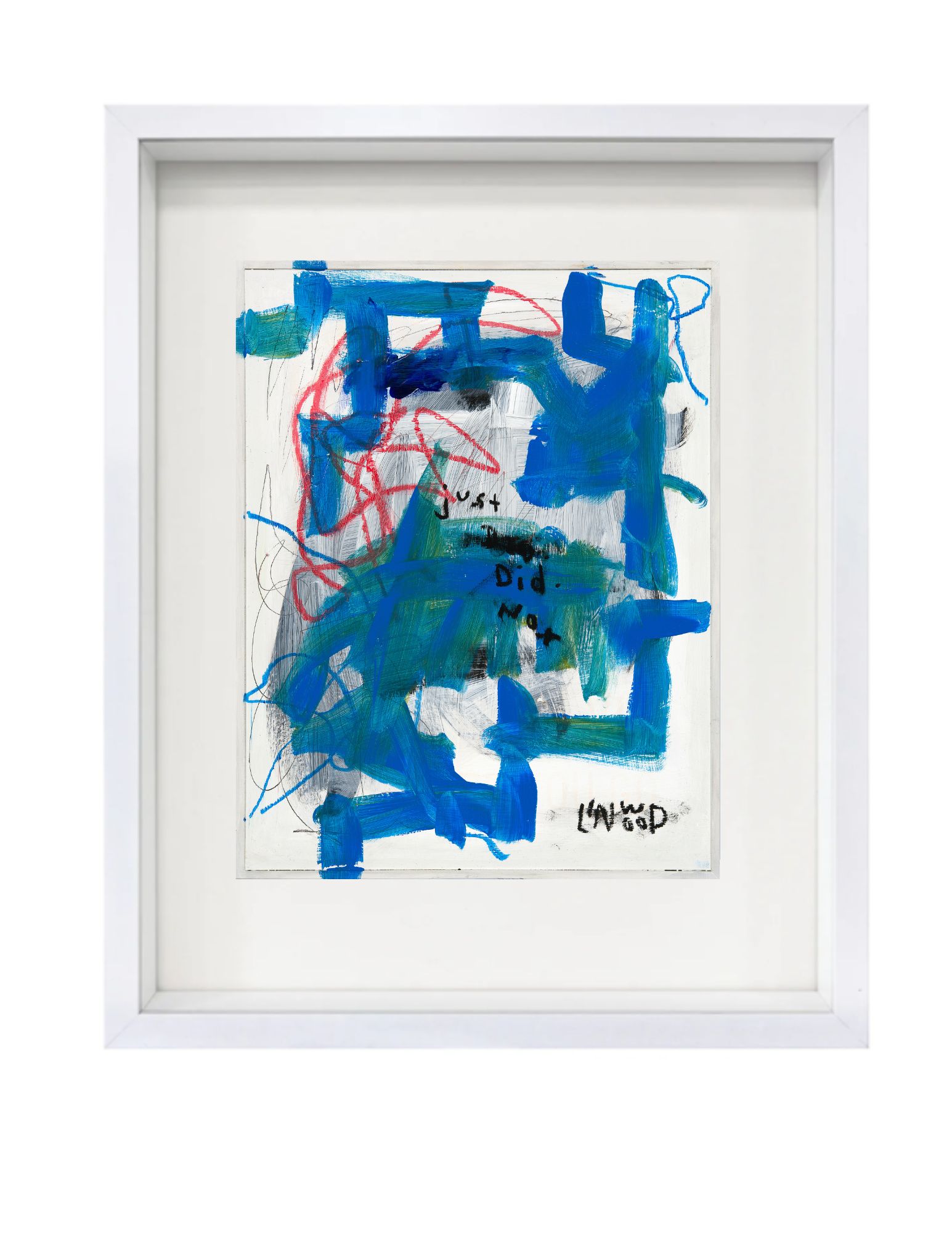 Saturated blues move forcefully across the canvas, layered with quick, gestural strokes and restless lines that feel both urgent and unresolved. Moments of red and black punctuate the composition, adding tension and contrast within the otherwise fluid field. At its core, the piece captures a fragment of thought—just did not—left intentionally incomplete, as if the sentence trails off before resolution.
