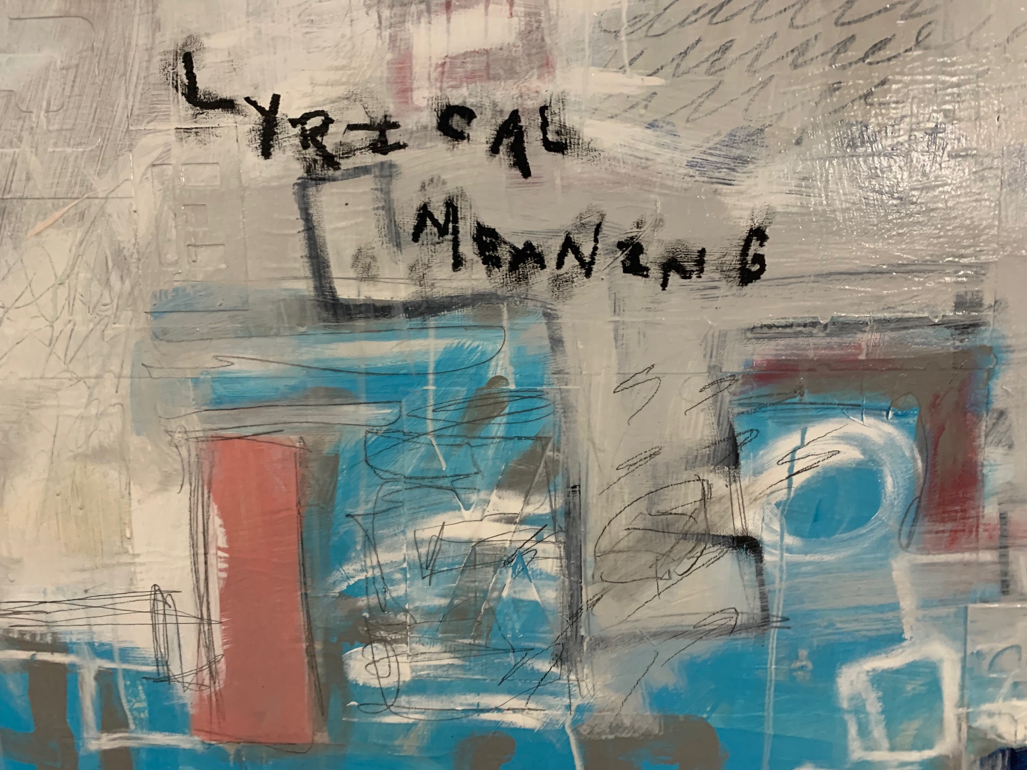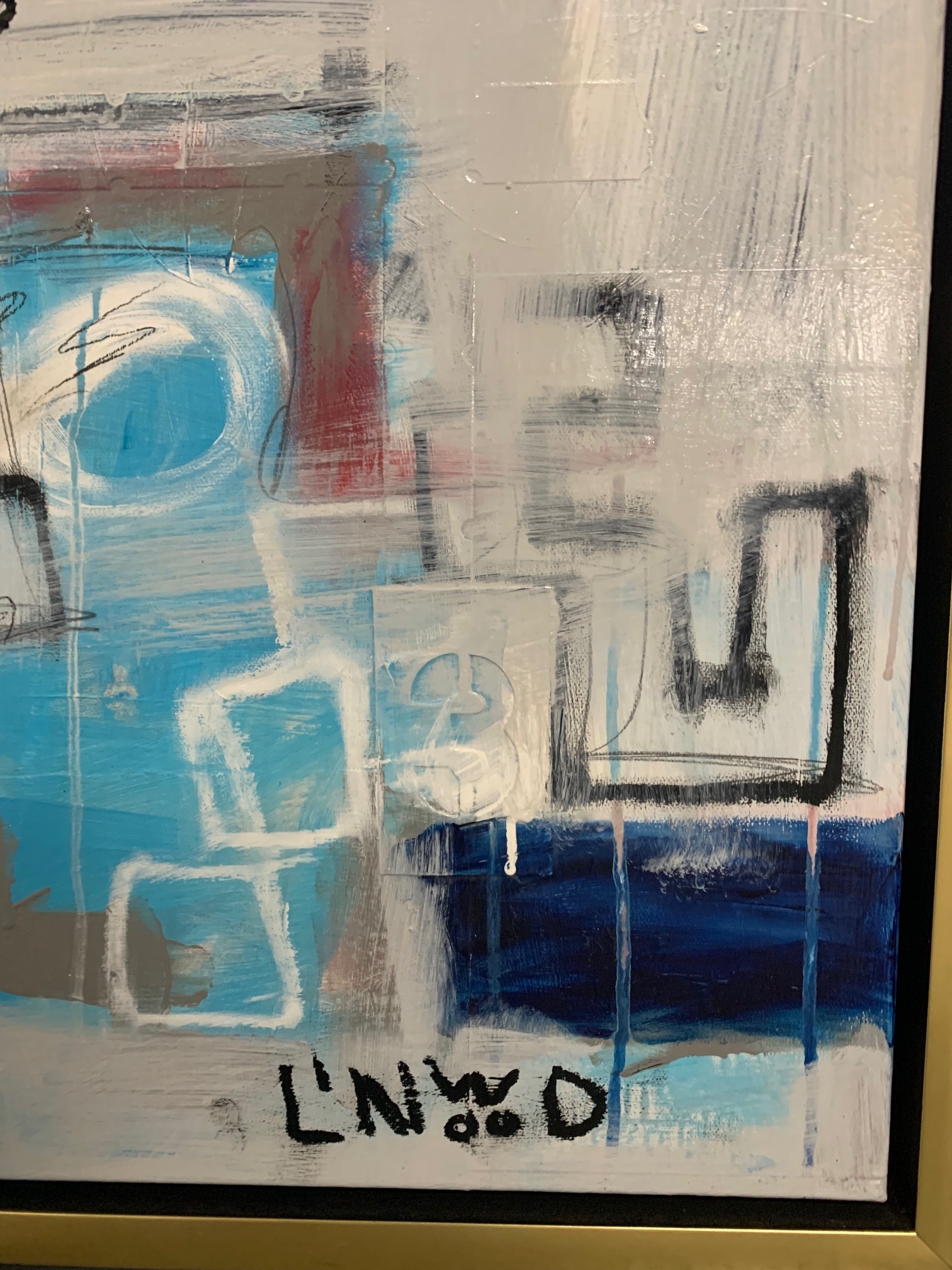 Some of Linwood’s newest abstract art is bold in both color and neutral hues. Here, various shades of grey interact with pure blacks, and pops of muted pastels. Linwood’s brush strokes are confident and assured – serene and unchanged. The canvas is noteworthy for strong graphic appeal, texture, layers of glazed and overpainted documents and artist graffiti. Modern art for uncommon interiors. Framed in Gold.