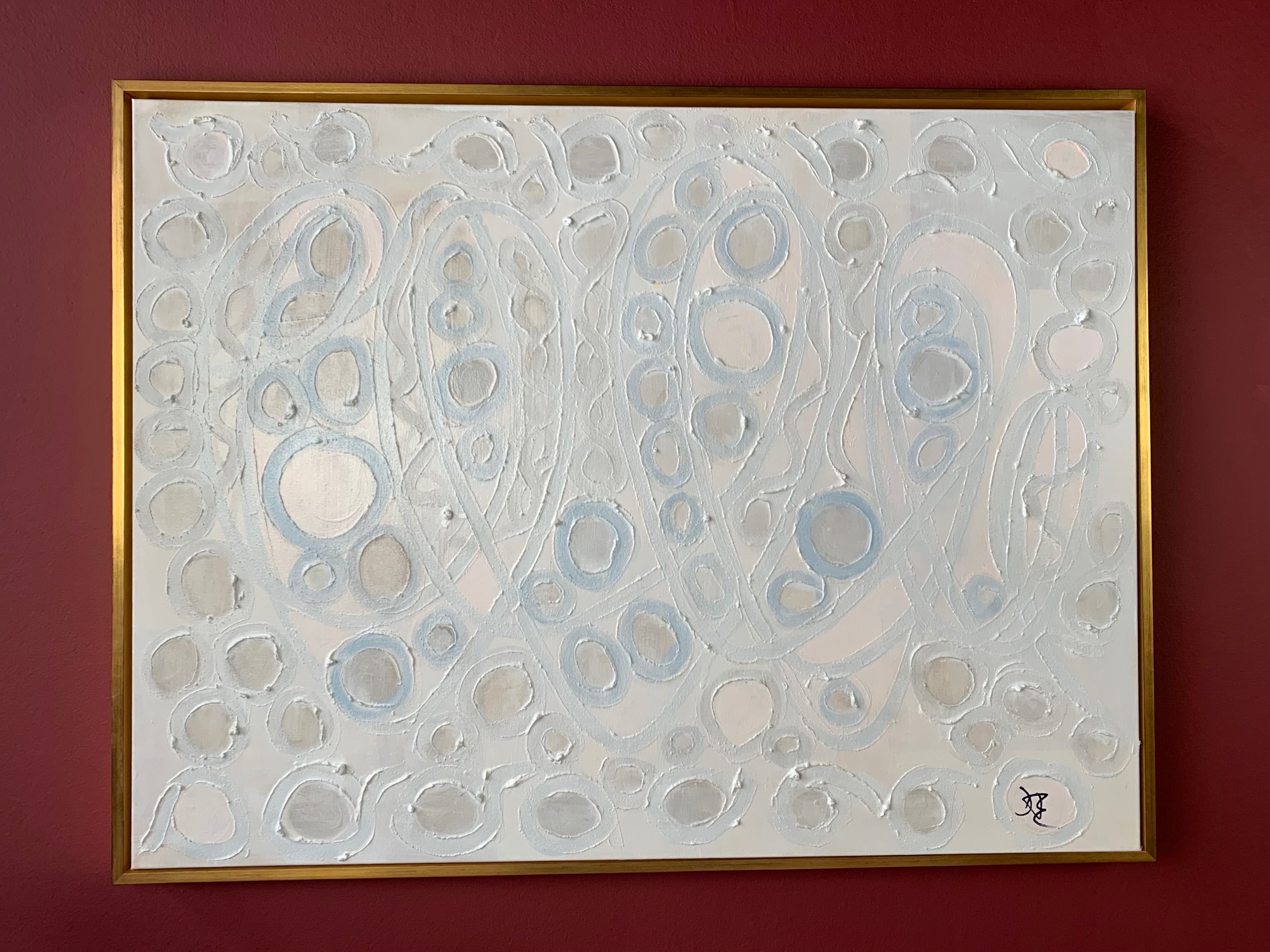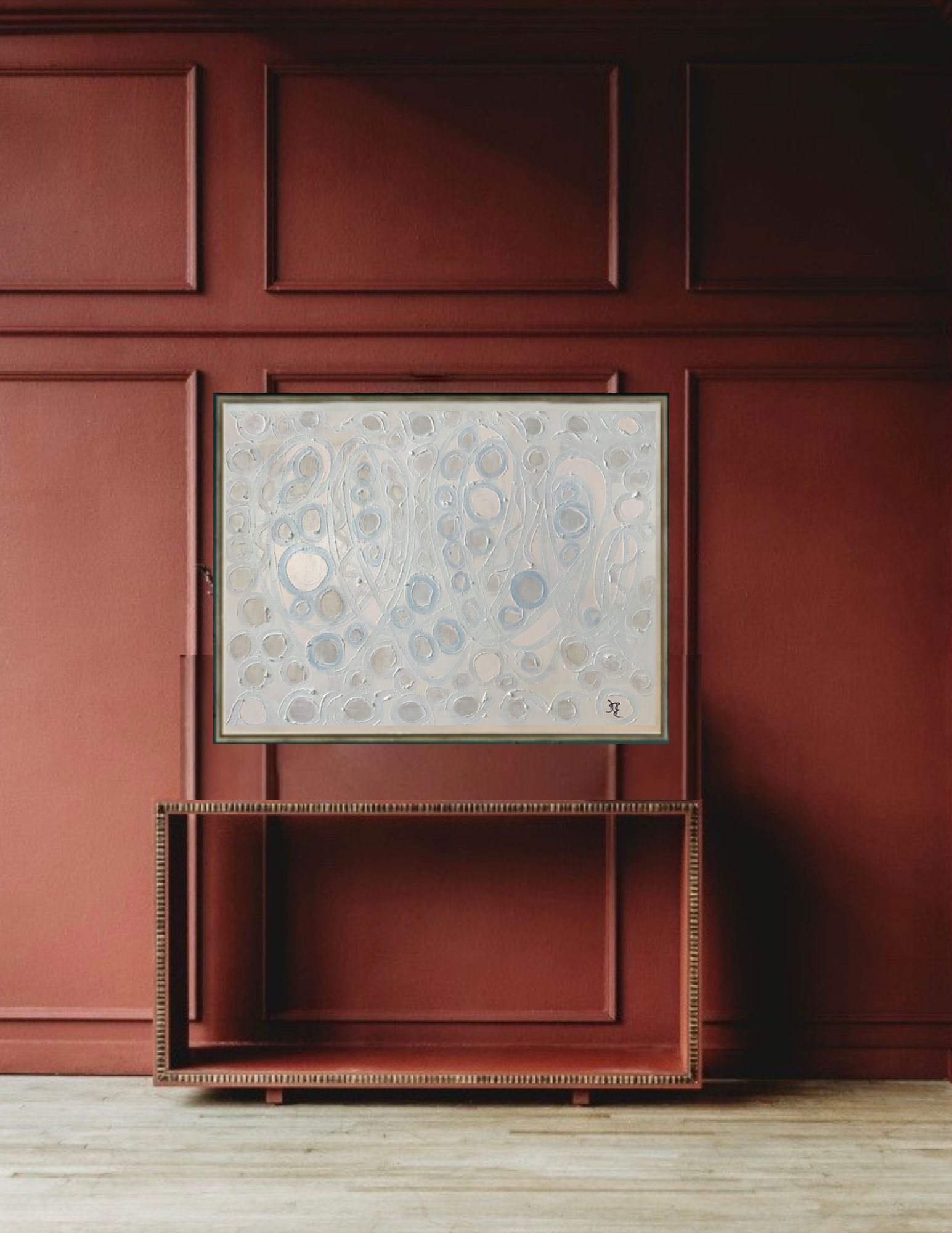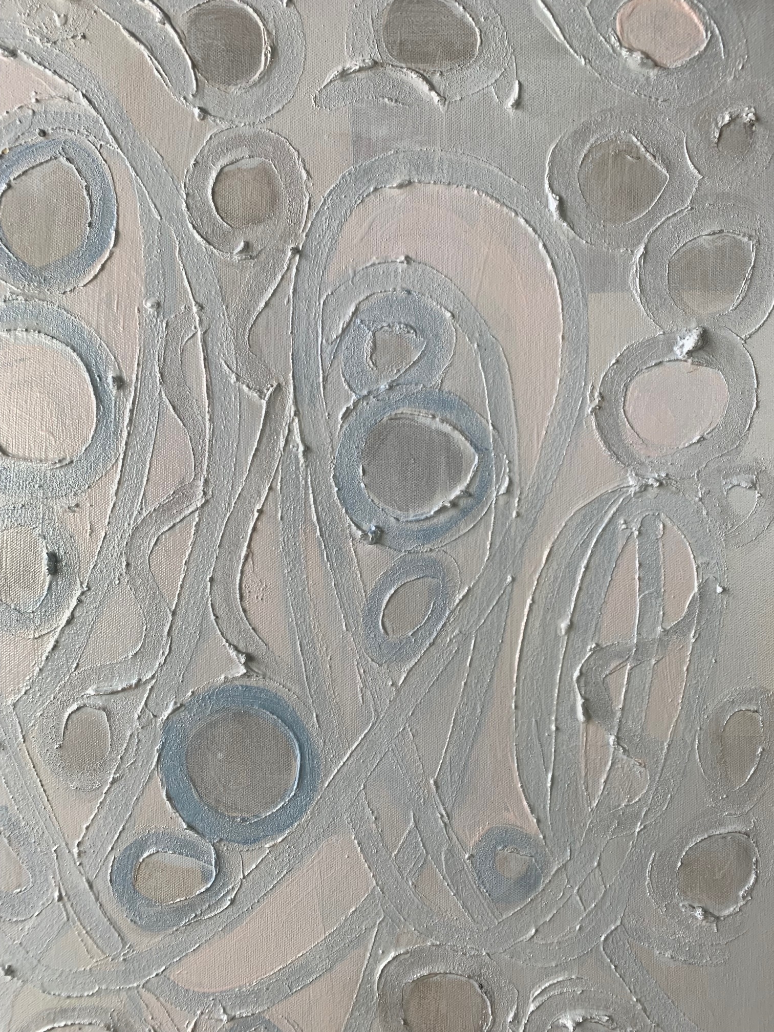 Softly rhythmic and deeply textural, My Haven unfolds as a quiet sanctuary in form and tone. Layers of plaster create a dimensional surface where looping, organic motifs rise and recede—each mark hand-formed, each impression holding a sense of calm repetition. The composition flows in gentle vertical currents, suggesting both structure and ease, like a space designed for pause. A restrained palette of pale blues, warm neutrals, and chalky whites enhances the piece’s meditative quality.