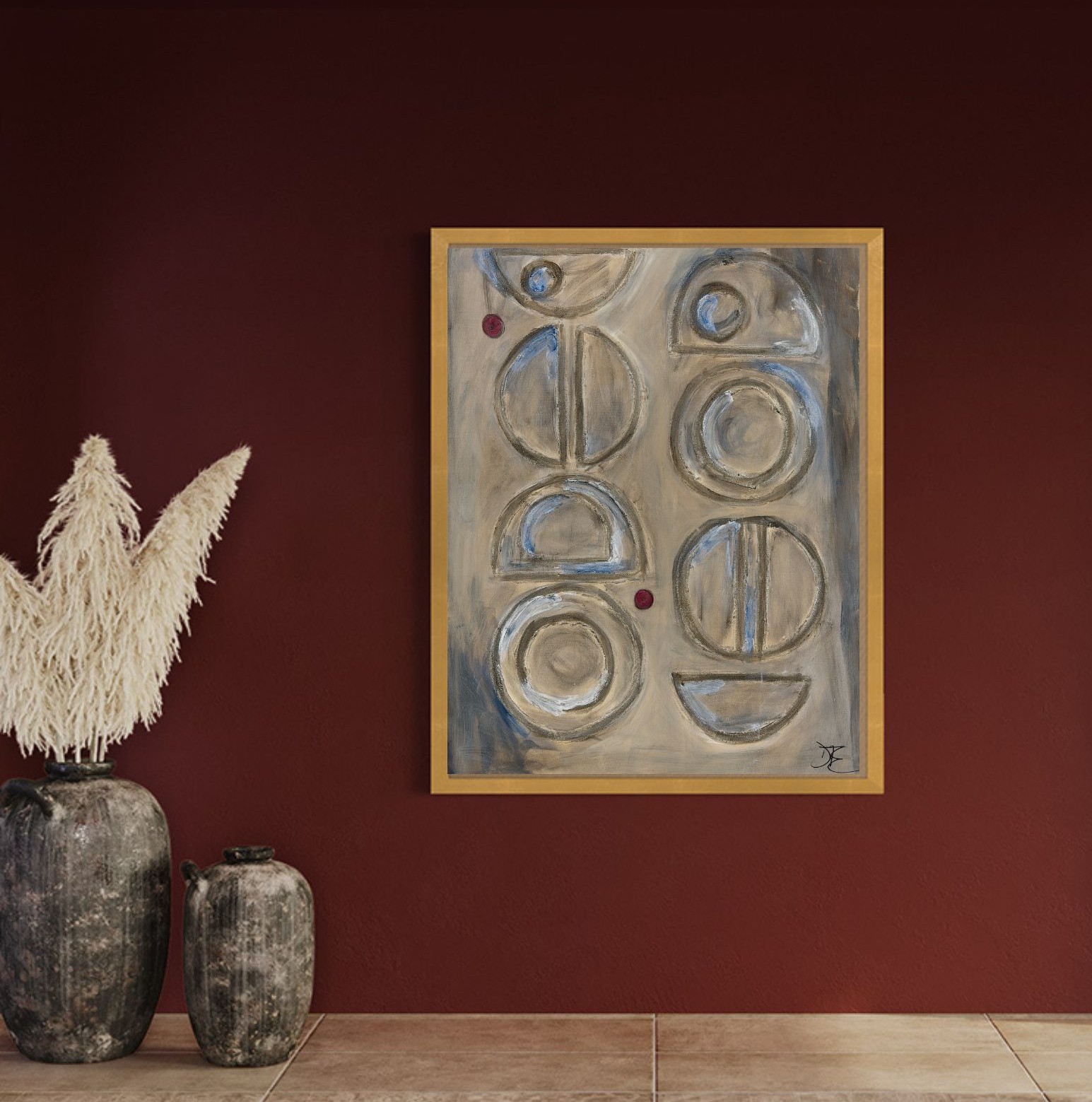 One Step Behind One Step in Front, DJE original art is an expression of life’s journeys and relationships, using shapes, patterns, color and texture as a symbolic interpretation of how things felt at the time. Discover meaning, solace, safety and ultimately joy in a chaotic meld. Mixed media on canvas.