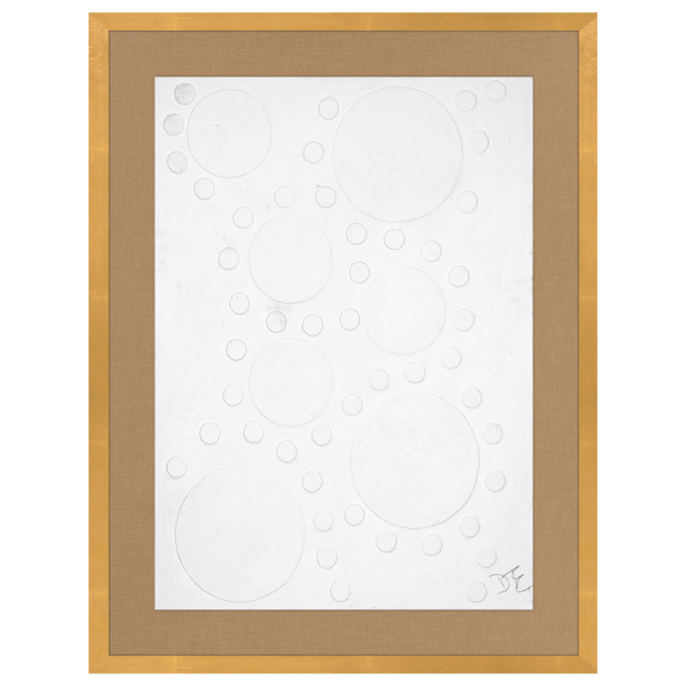 Energy is everywhere, always percolating. DJE original art is an expression of life’s journeys and relationships, using shapes, patterns, color and texture as a symbolic interpretation of life. Life is, in many ways, simply paths of ever present energies, expressed with the iconic circle form. Mixed media on canvas. Beige linen mat set under glass in a gold frame.
