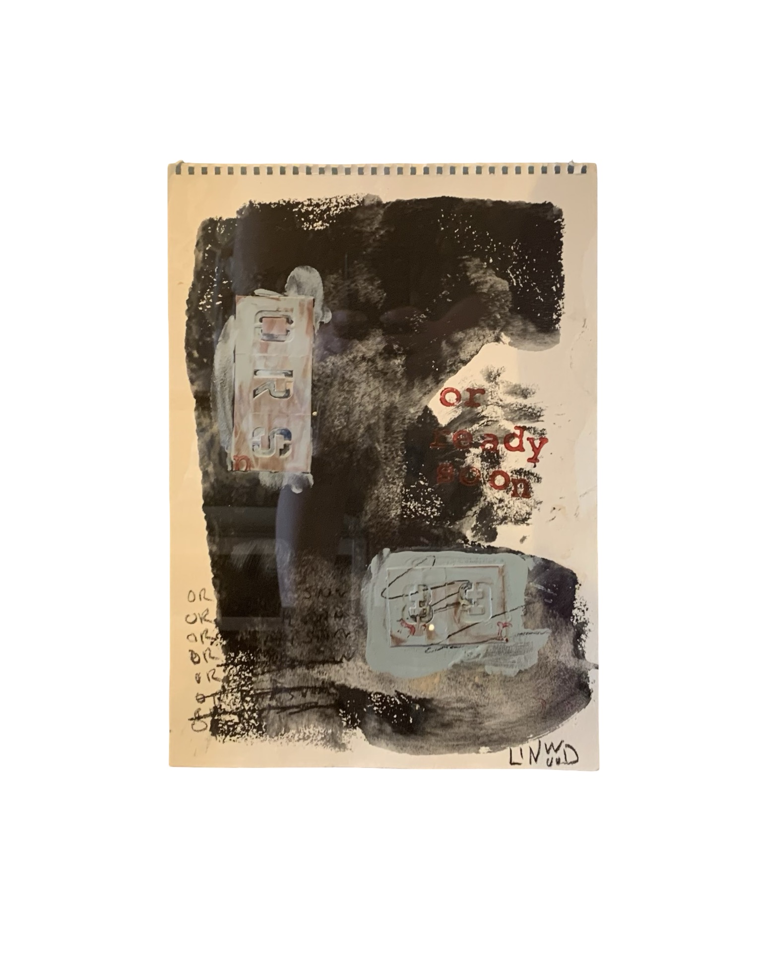 Or Ready Soon is an intimate, immediate work—raw in execution and direct in message. Built on paper and presented within a shadowbox frame, the composition centers on a bold, inked field that feels both obscured and revealed, as if something is emerging through shadow.