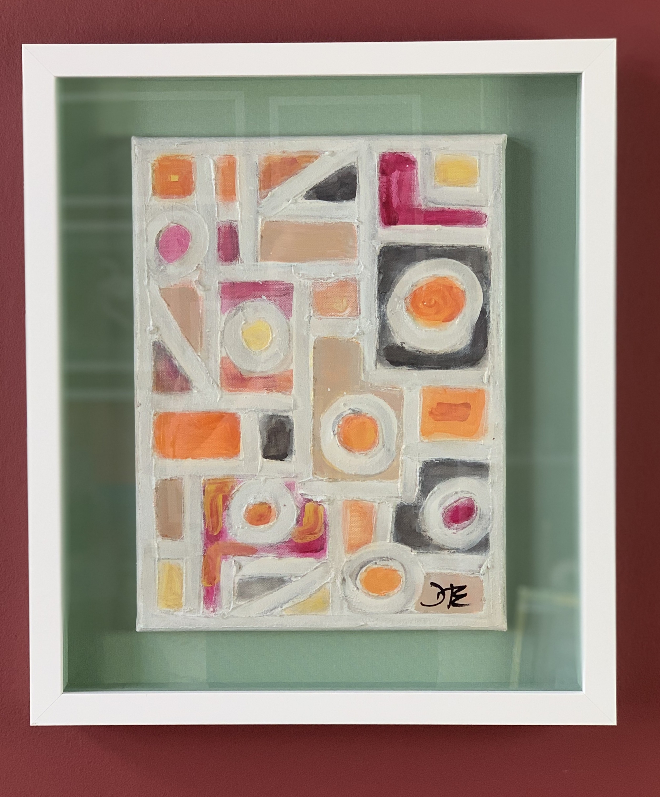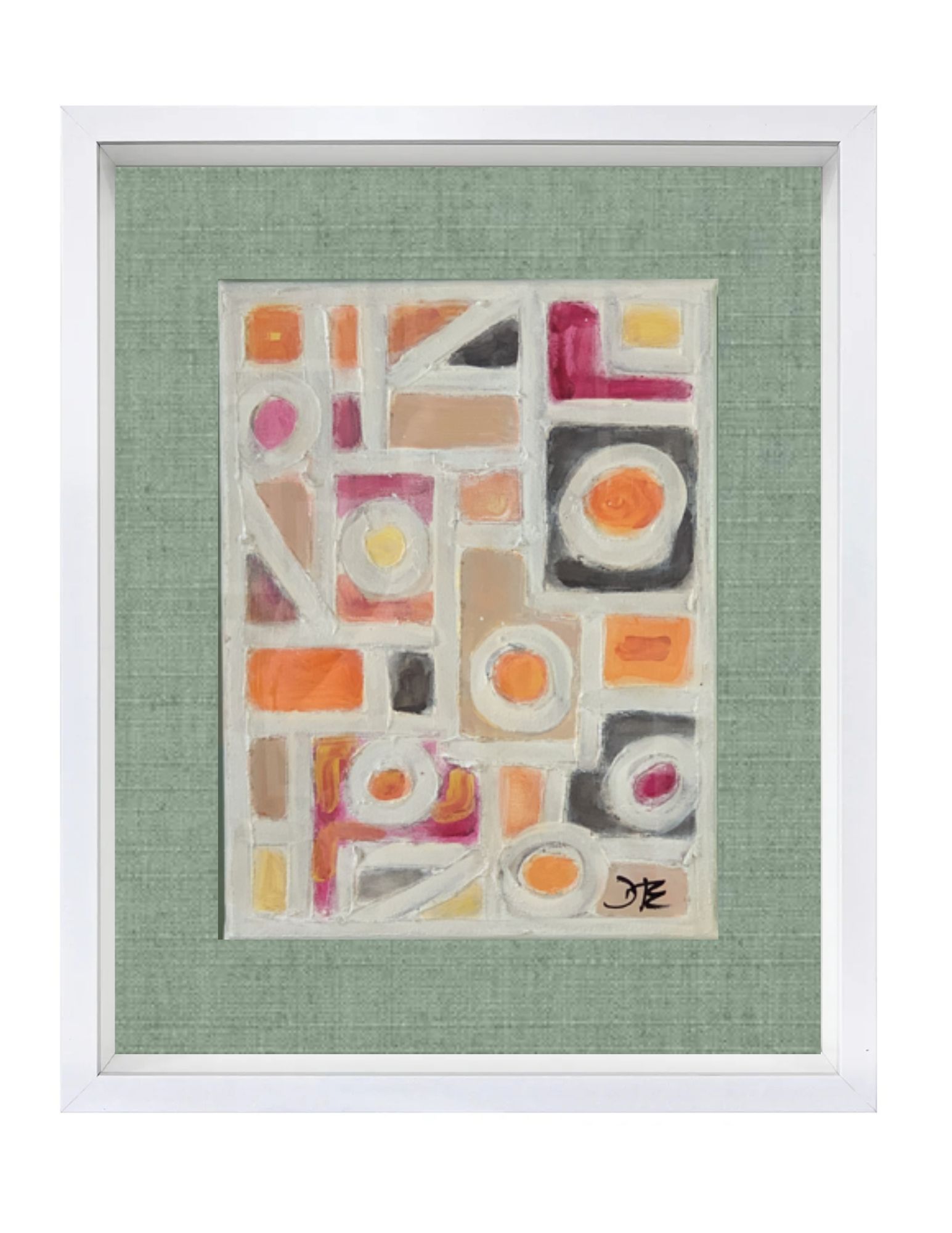 Structured yet expressive, Roots and Branches explores the balance between foundation and growth through a carefully composed grid of form and color. Segmented blocks—each holding its own shape, tone, and texture—come together to create a unified visual language, suggesting the interconnectedness of origin and expansion. Beautifully framed in a white shadowbox.