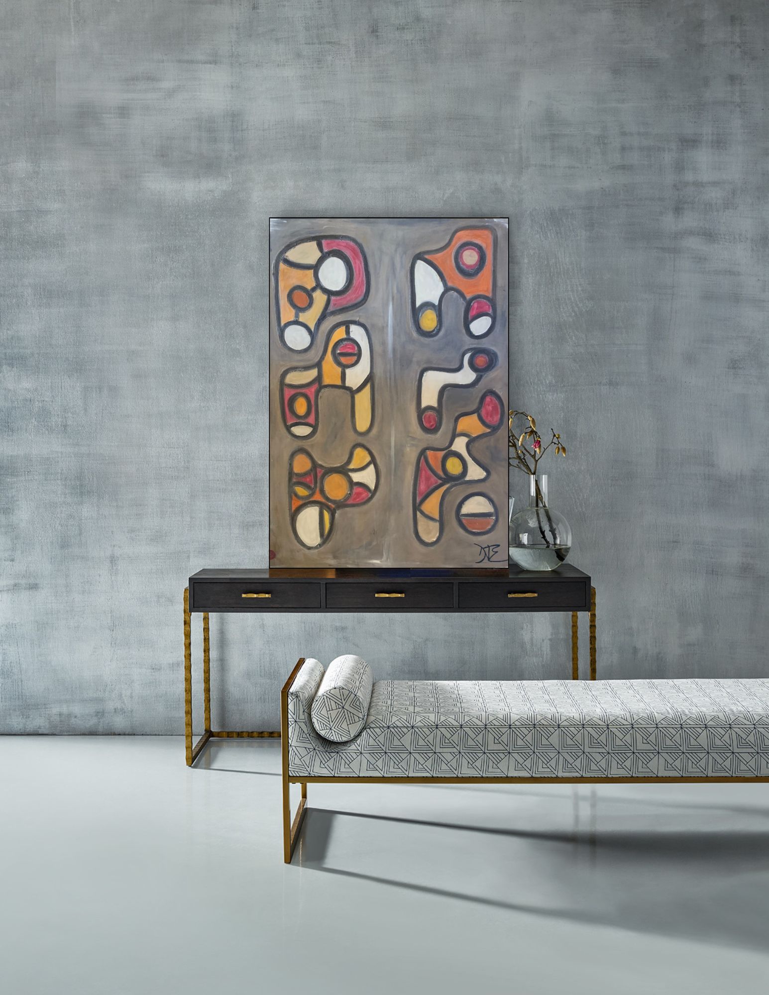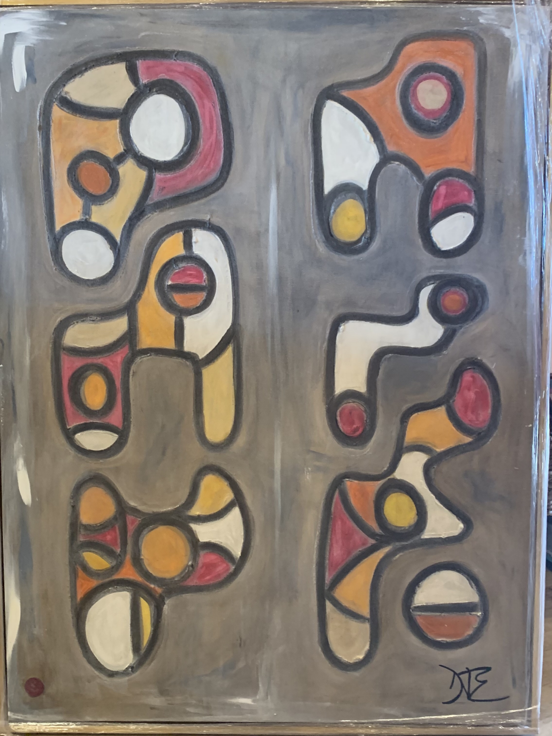 Bold, sculptural shapes—outlined in deep charcoal—frame a palette of warm ochres, soft creams, coral reds, and punctuations of golden yellow. Set against a muted, atmospheric ground, the composition balances energy with restraint—allowing the color and form to take focus without overwhelming the eye.