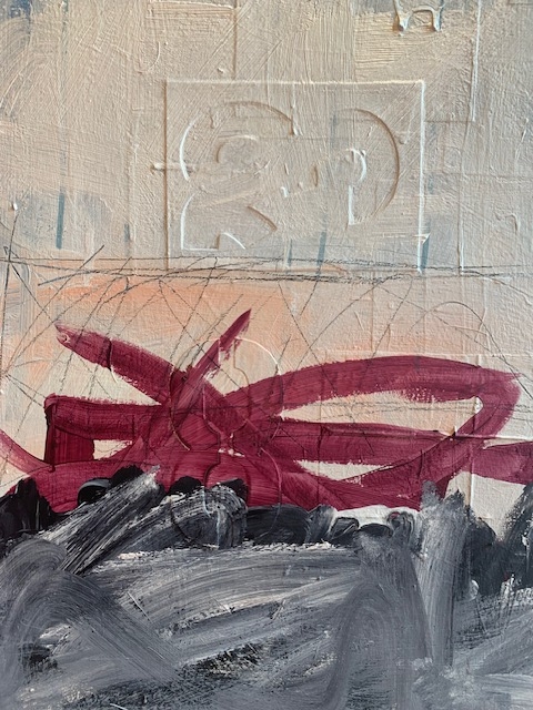 Still Time- a piece worth acknowledging. Linwood creatively develops the canvas to show meaning. Take note of Linwood’s language: rich brush strokes, bold color, graphic shapes, casual calligraphy and – as always – understated bateau symbolism suggesting the journey. The dripping paint, the splotchy patterns, all pulled together to form a beautiful piece.