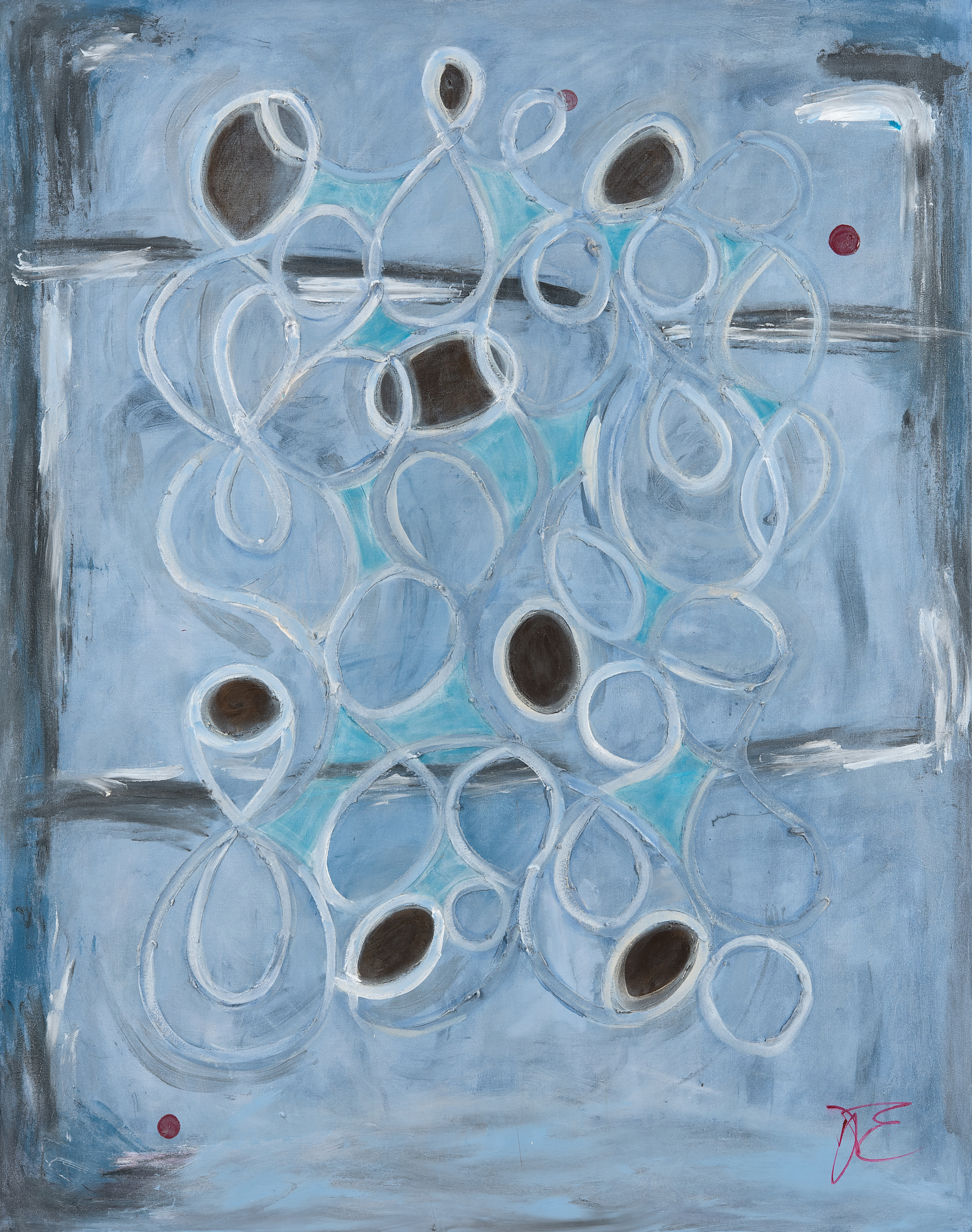 Set against a layered field of atmospheric blues and slate tones, the background provides a quiet structure, while washes of pale turquoise emerge beneath the linework, adding depth and a subtle sense of movement. Dark, organic centers punctuate the composition, grounding the airy loops with moments of weight and contrast.