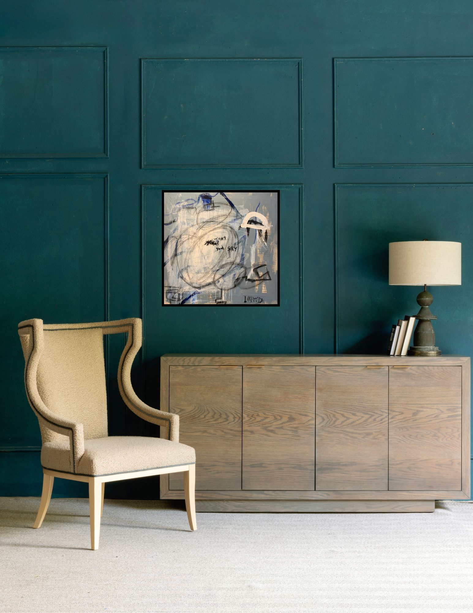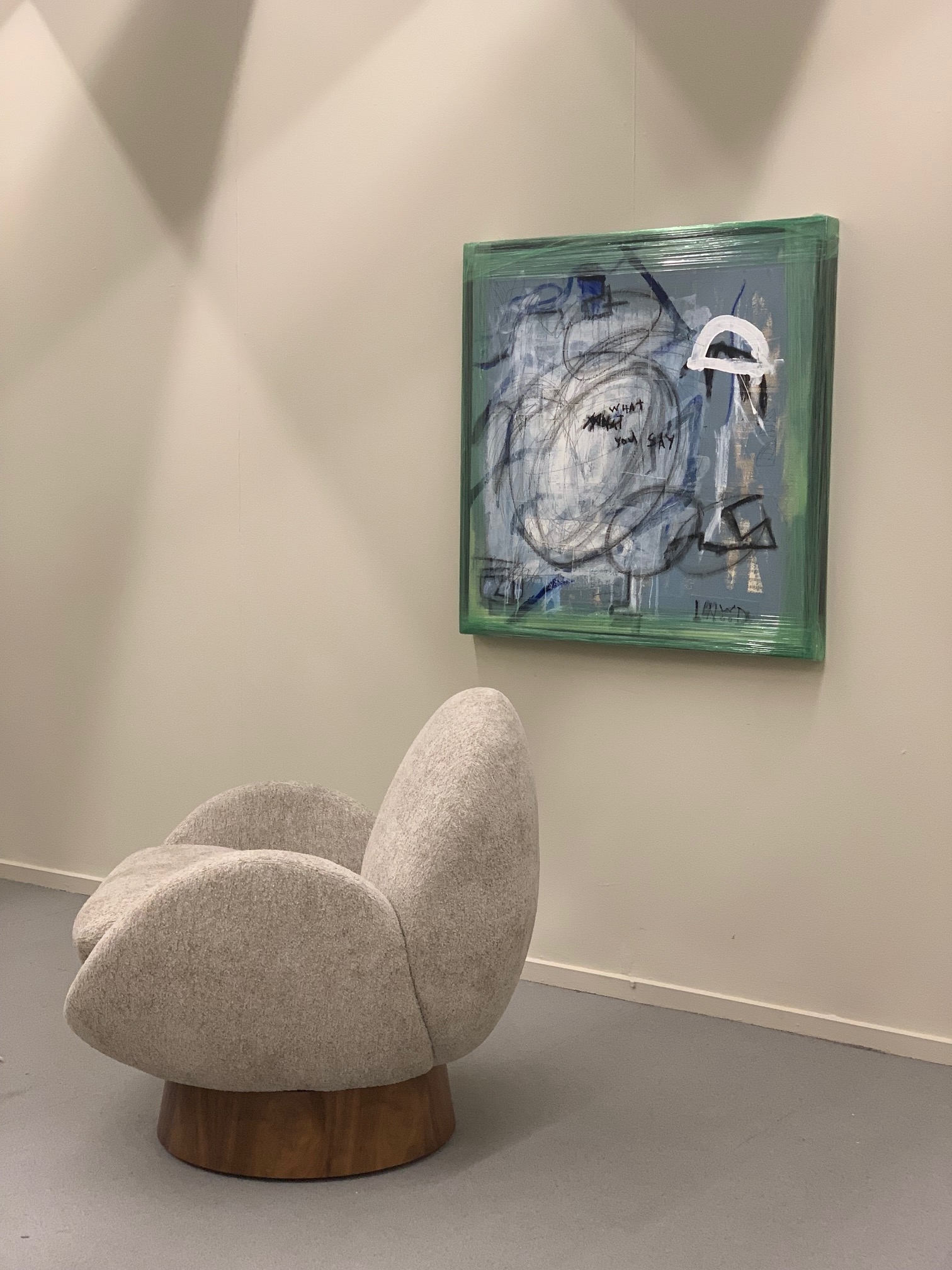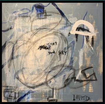 What You Say explores the tension between expression and interpretation—what is spoken, what is heard, and what lingers in between. A restrained palette of soft greys, muted blues, and layered neutrals creates an atmospheric ground, where marks feel both deliberate and unresolved.