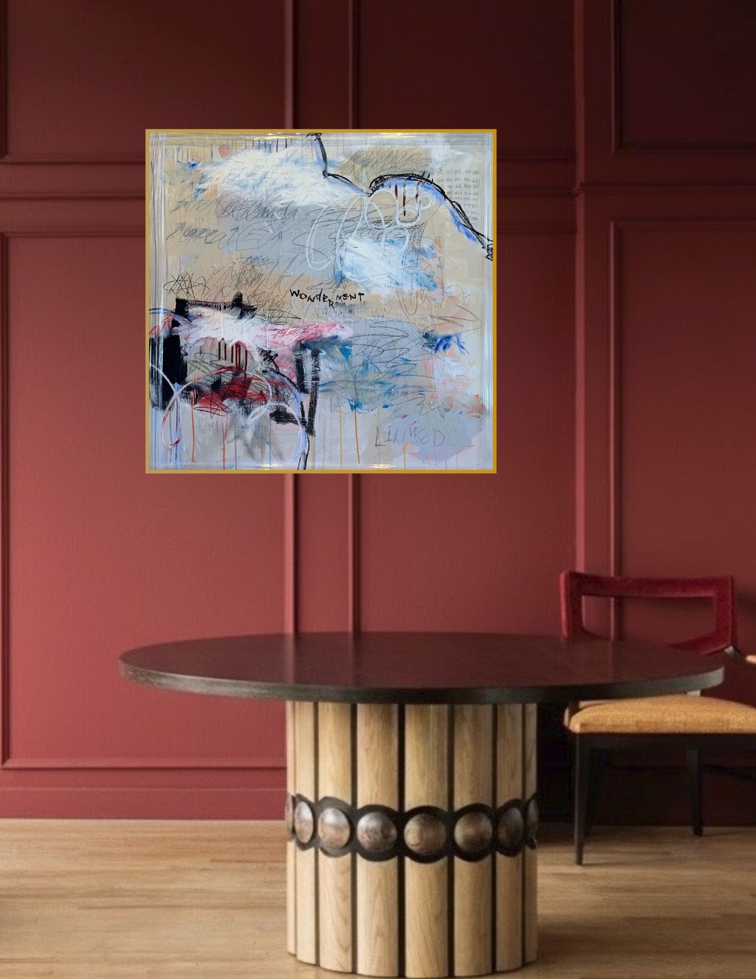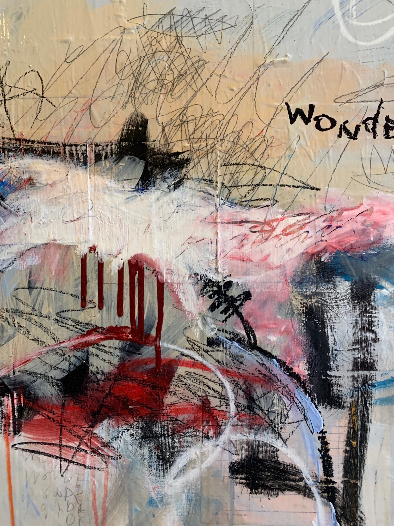 At its center, the handwritten word—wonderment—emerges as both anchor and invitation, reinforcing the emotional tone of rediscovery and openness. Linwood’s signature language is evident throughout: expressive line, layered surfaces, and a balance between control and spontaneity.