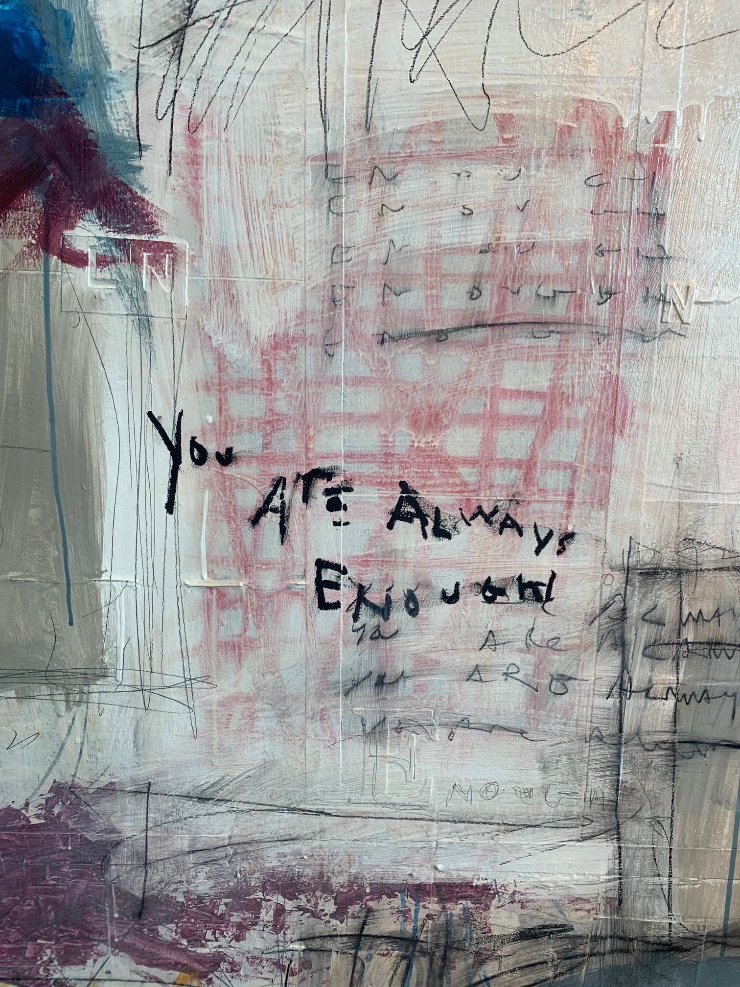 Linwood Art, art with meaning. You Are Always Enough is a perfect example. The canvas is noteworthy for texture, creative colors, and artist graffiti. Take note of Linwood’s language: rich brush strokes, bold color, graphic shapes, casual calligraphy and – as always – understated bateau symbolism suggesting the journey. A piece created to tell a story.